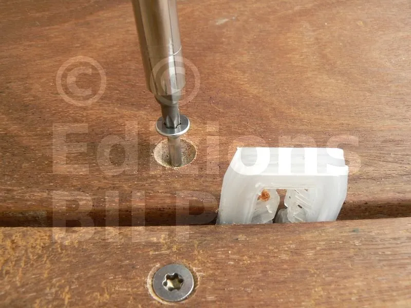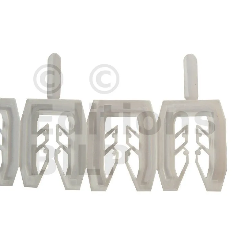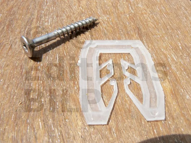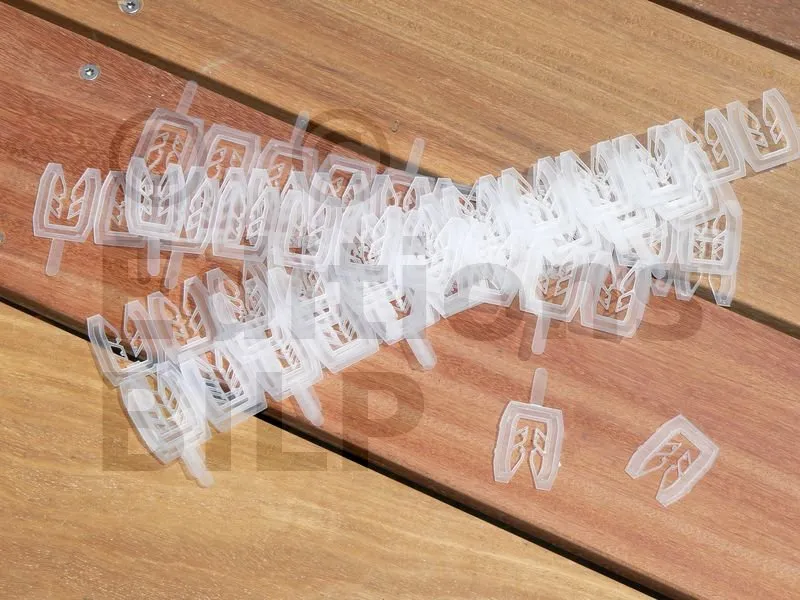 Chaque cale comporte un peigne intérieur (ou fourchette) qui permet de clipser la cale, ou un ensemble de cales, sur une vis. On peut clipser efficacement sur des vis, ou tirefond, ou tige filetée, de diamètres allant de 3 à 9 mm. Ainsi, la cale reste sur son support même si celui-ci bouge. La moitié des cales comporte une petite languette qui vous permettra de l’insérer et la pousser facilement sous un espace restreint, sous une lambourde par exemple.