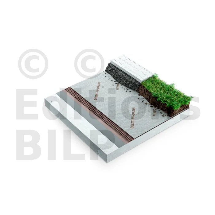 - MatériauNappe alvéolaire : Polyéthylène haute densité - Géotextile : Polypropylène thermosoudé sur les excroissances