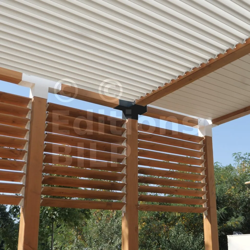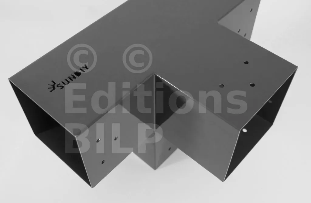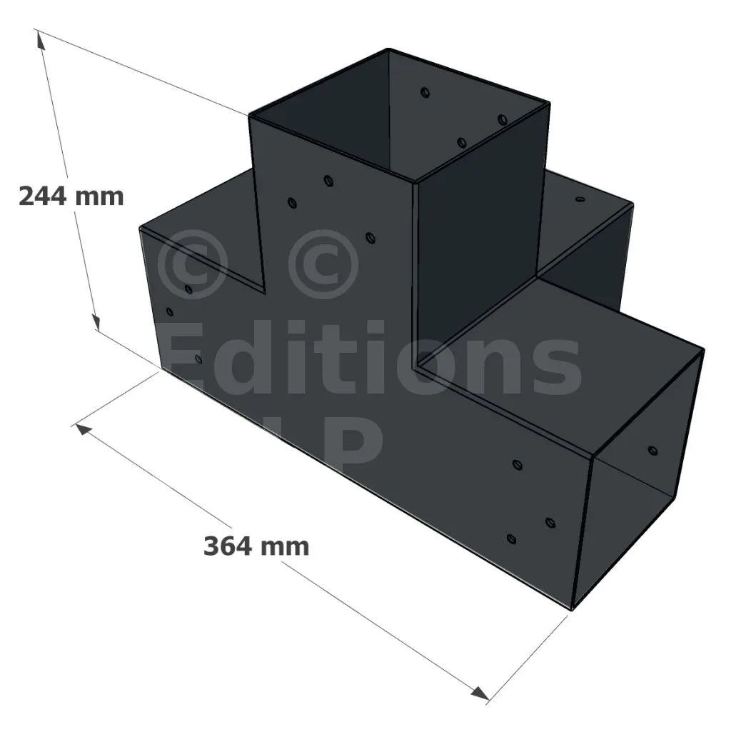 Il permet de raccorder une poutre de 120x120mm perpendiculairement à un chevron de 120x120mm, le tout étant supporté par un poteau vertical de 120x120mm.