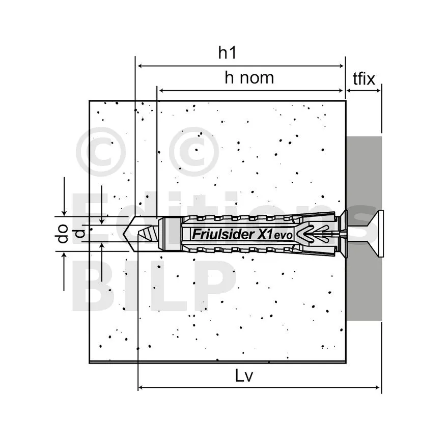 | Références | Dimensions [d0xL] [mm] | Ø vis (Min/Max) | Ø perçage [d0] [mm] | Profondeur mini perçage* [h1] [mm] | Profondeur d’ancrage nominale* [hnom] [mm] | |