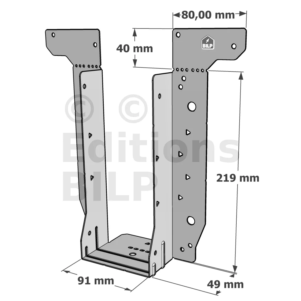 - Étrier fourni avec ses brides supérieures droites, pliables sur chantier afin de s’adapter à toutes les hauteurs de solives,