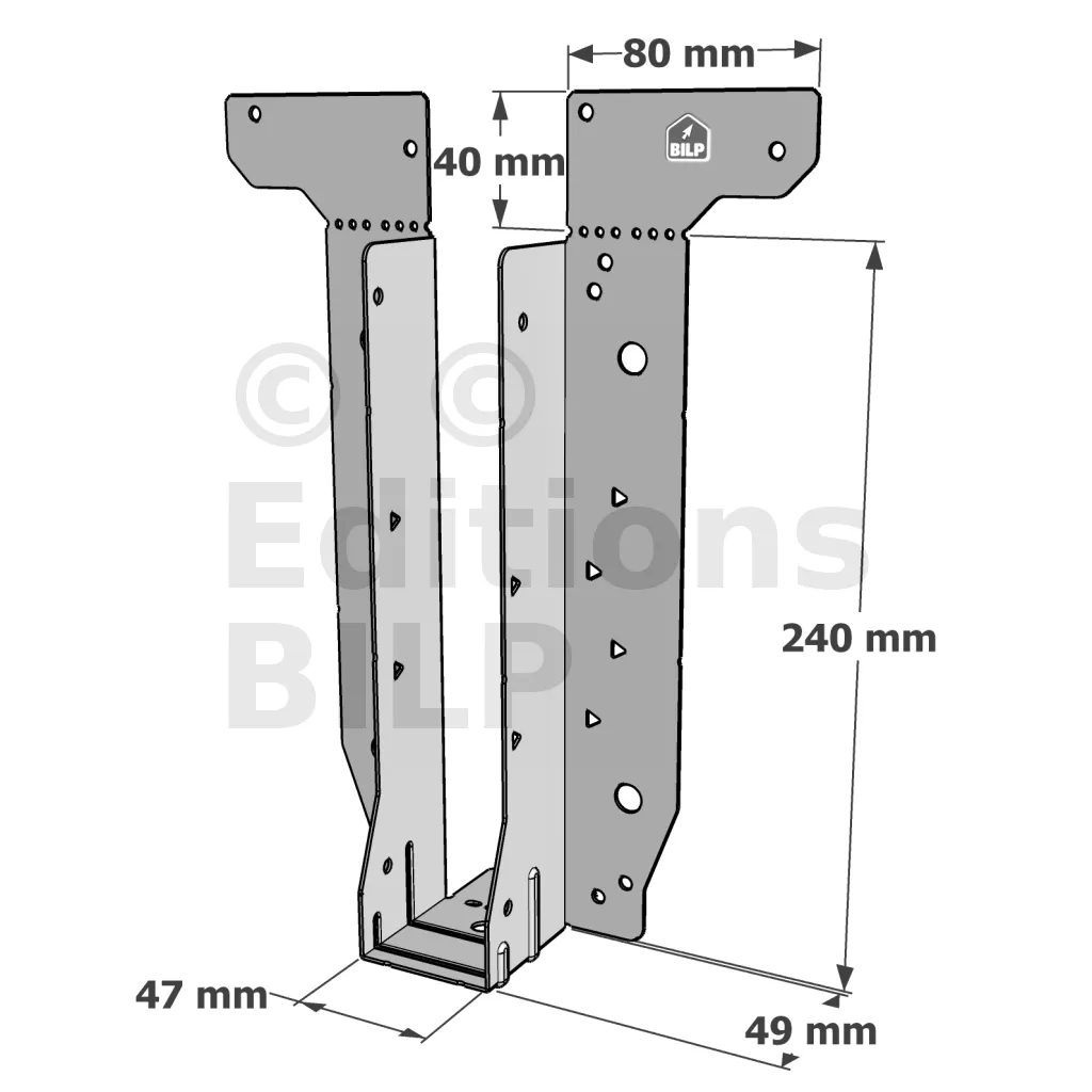 - Étrier fourni avec ses brides supérieures droites, pliables sur chantier afin de s’adapter à toutes les hauteurs de solives,
