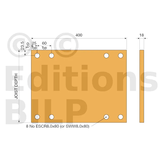 1. Cas d’une poutre porteuse métallique ajourée : installer une plaque en contreplaqué de 18 mm sur la face de la solive à âme métallique. Cette plaque doit avoir une longueur minimum de 400 mm et couvrir toute la hauteur de la solive à âme métallique. La plaque en contreplaqué est installé avec 8 vis ESCR8,0x80mm, positionnées conformément à l’illustration ci-dessous,