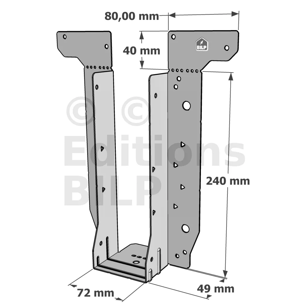 - Étrier fourni avec ses brides supérieures droites, pliables sur chantier afin de s’adapter à toutes les hauteurs de solives,