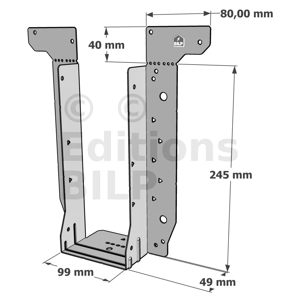 - Étrier fourni avec ses brides supérieures droites, pliables sur chantier afin de s’adapter à toutes les hauteurs de solives,