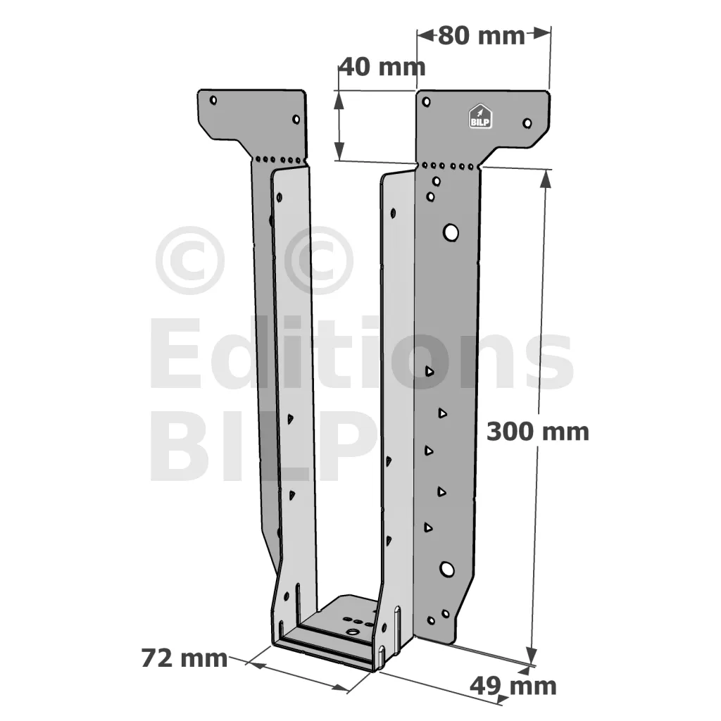 - Étrier fourni avec ses brides supérieures droites, pliables sur chantier afin de s’adapter à toutes les hauteurs de solives,