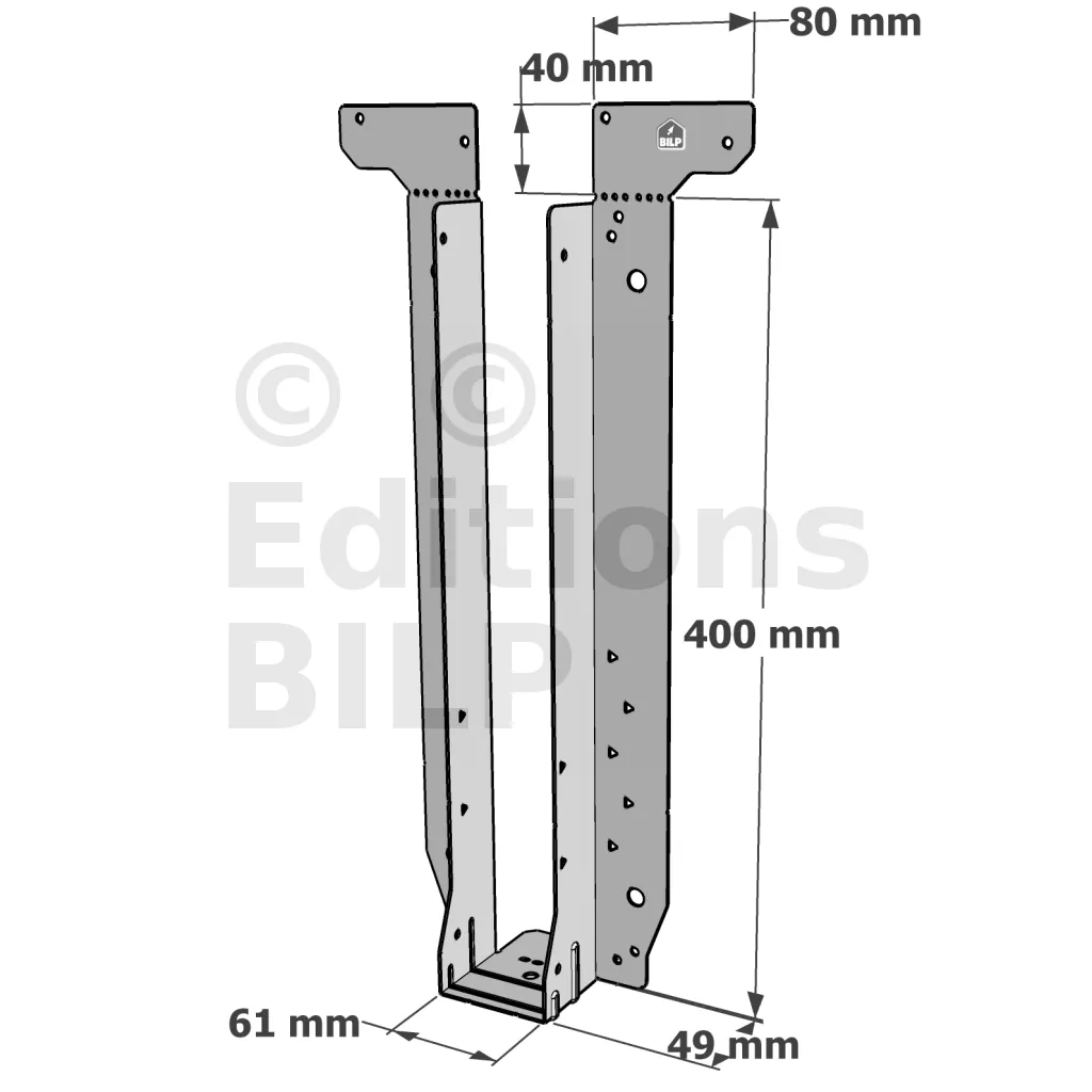 - Étrier fourni avec ses brides supérieures droites, pliables sur chantier afin de s’adapter à toutes les hauteurs de solives,