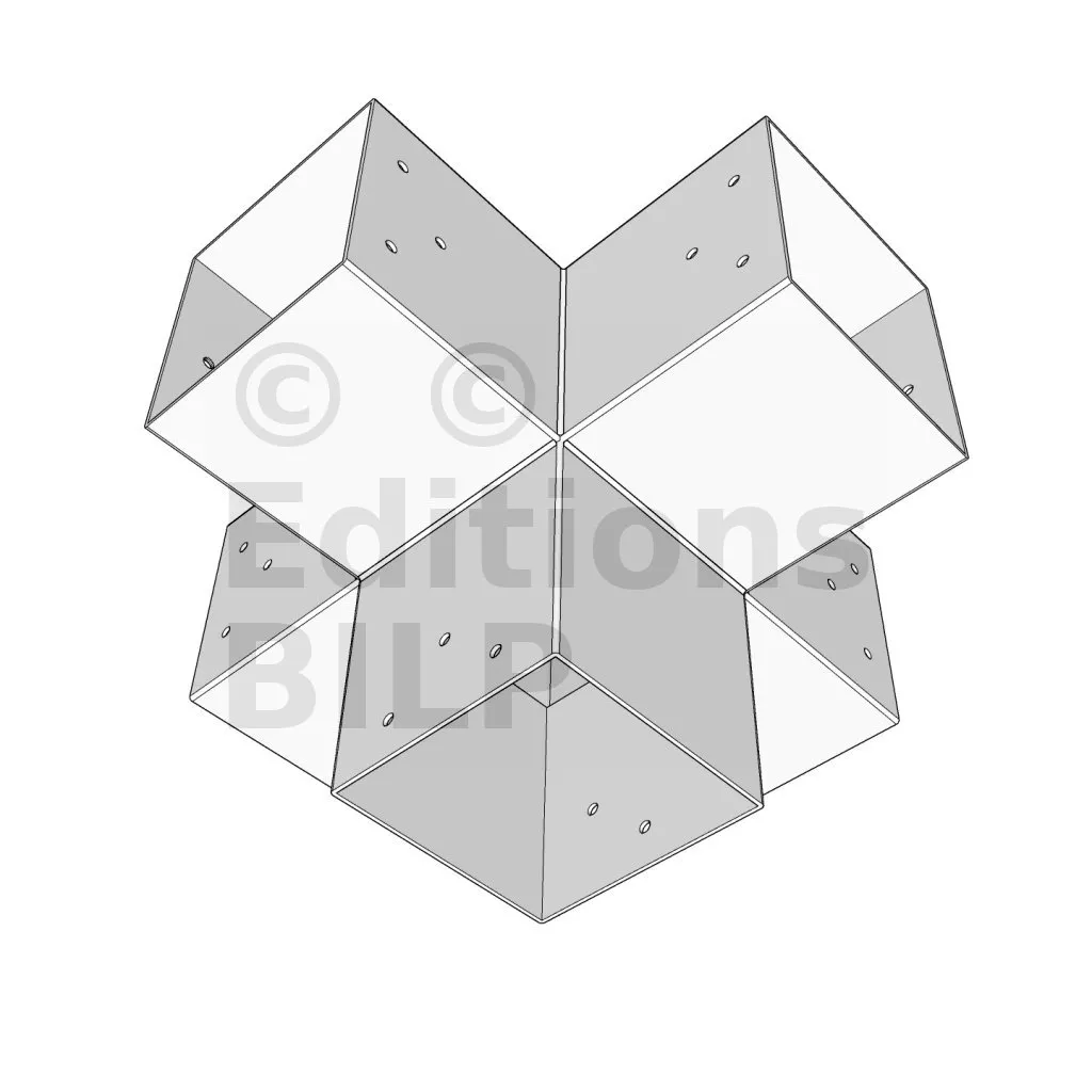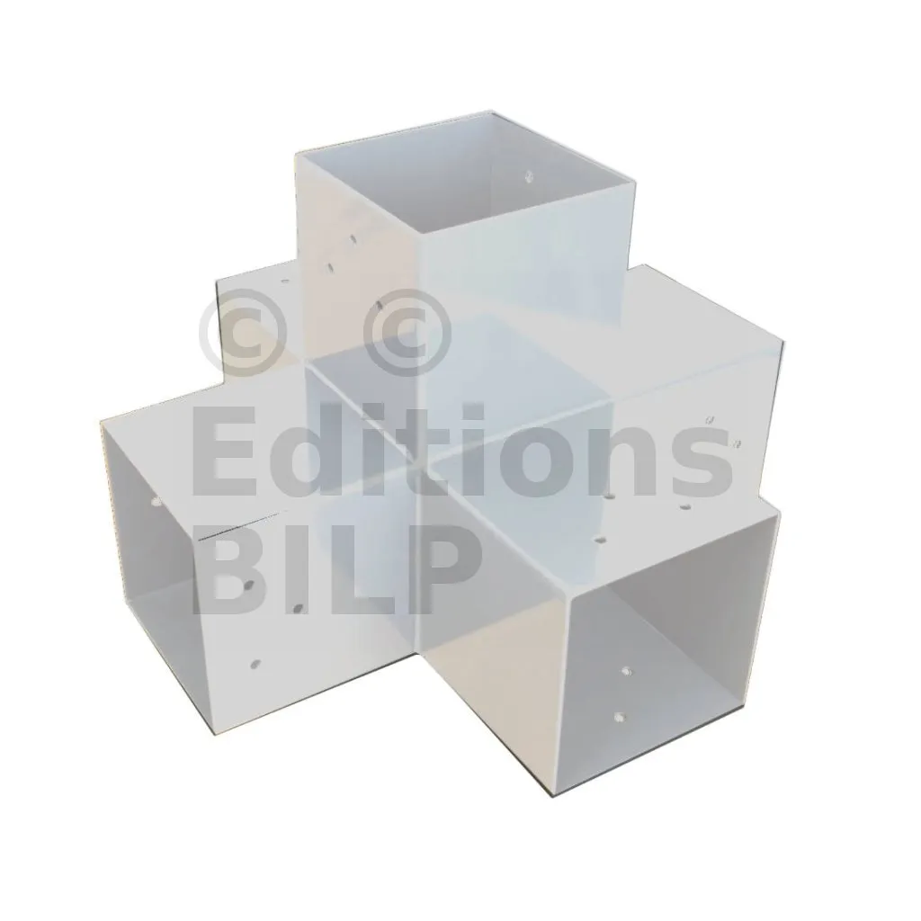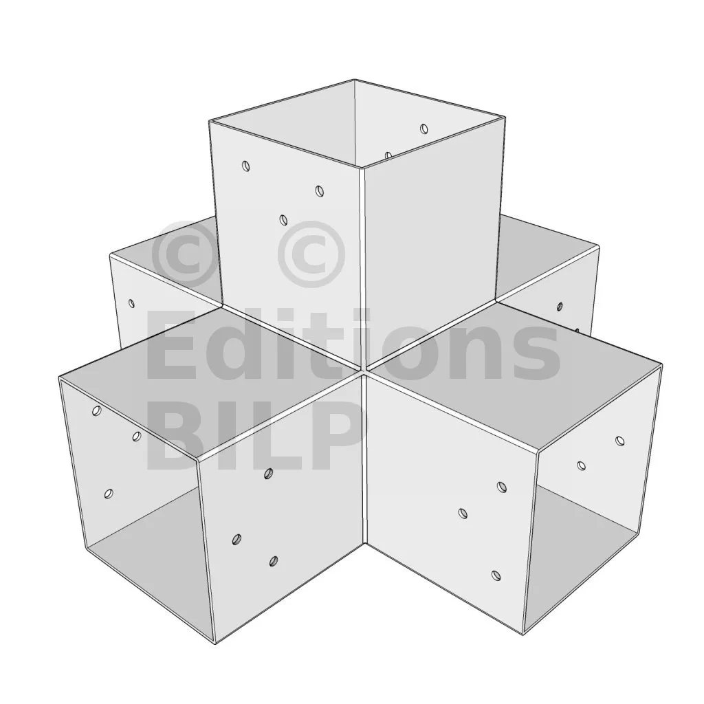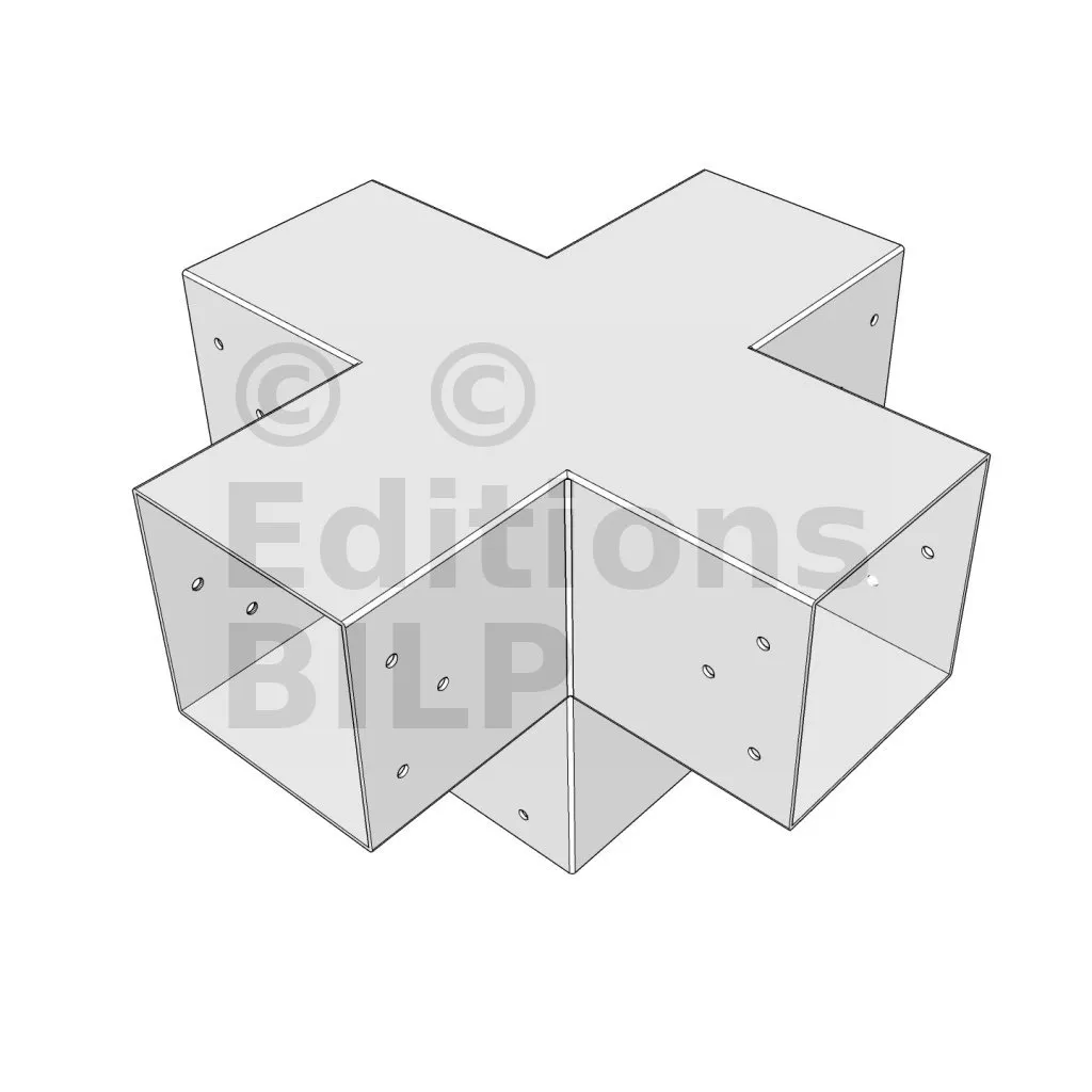 Il permet de raccorder deux poutres 120x120mm perpendiculairement à une autre poutre 120x120mm, le tout étant supporté par un poteau vertical de 120x120mm.