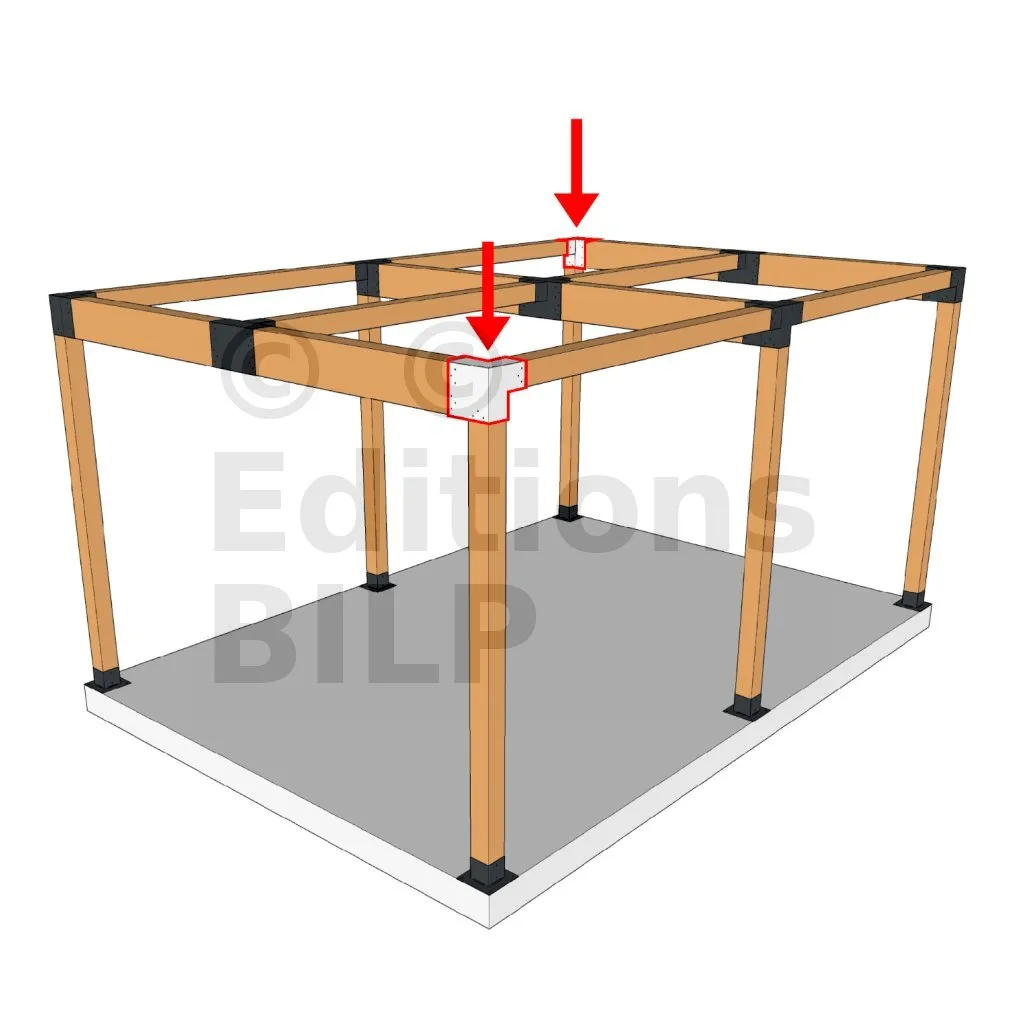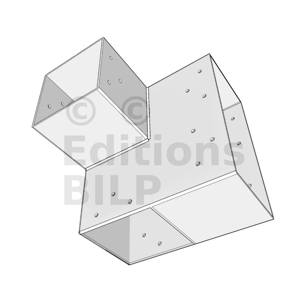 Il est utilisé dans un angle extérieur. Ce connecteur va permettre de raccorder une grosse poutre 240x120mm perpendiculairement à une poutre 120x120mm, le tout étant supporté par un poteau vertical 120x120 mm.