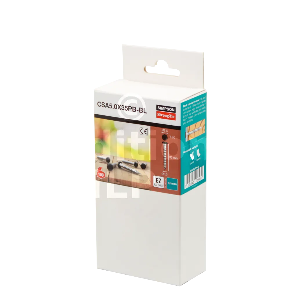 Les vis CSA5.0x40ZPB ont été étudiées pour la mise en œuvre discrète des équerres et des connecteurs en finition noire. Leur tête conique assure un contact complet avec le connecteur. L’empreinte étoile permet de maintenir la vis lors du montage.
