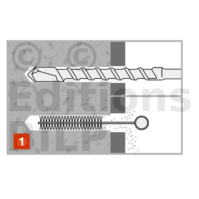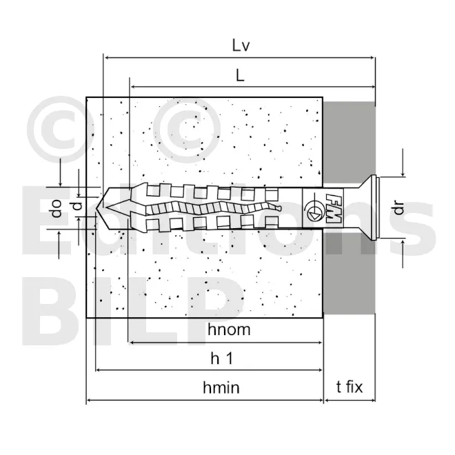 | Références | Réference produit | Dimensions [d0xL] [mm] | Ep. max élément à fixer [tfix] [mm] | Profondeur mini perçage [h1] [mm] | Profondeur d’ancrage nominale [hnom] [mm] | Ep. mini support [hmin] [mm] | Ø vis [d] [mm] | Longueur vis [Lv] [mm] | Ø colerette [dr] [mm] |