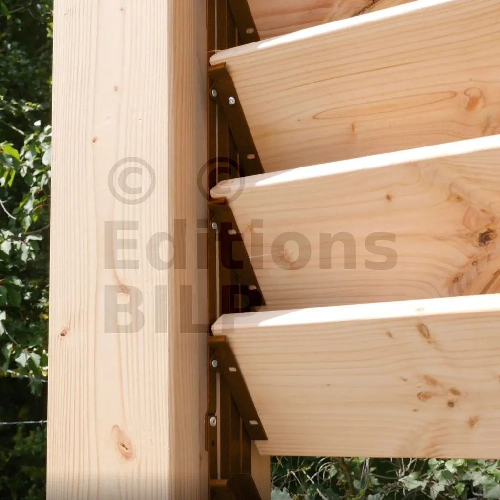 Les mécanismes constituent la base du SUNDIY. Ils permettent de couvrir une hauteur (ou profondeur) de 51cm, et jusqu’à une largeur de 150cm (conseillé) avec des lames en bois. Il est possible d’aller jusqu’à 200cm, mais le travail du bois risque d’être plus important au fil des ans.
