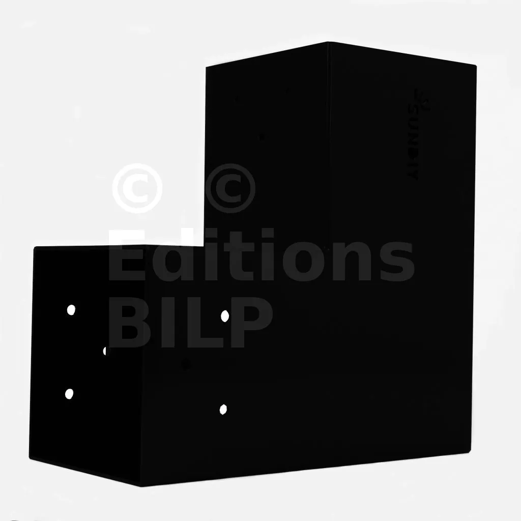 Il est utilisé dans un angle extérieur. Ce connecteur va permettre de raccorder une poutre 90x90mm perpendiculairement à une poutre 90x90mm, le tout étant supporté par un poteau vertical 90x90mm.