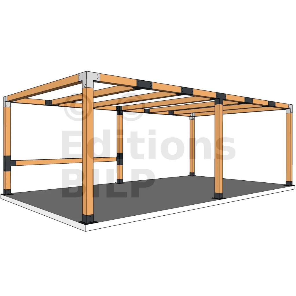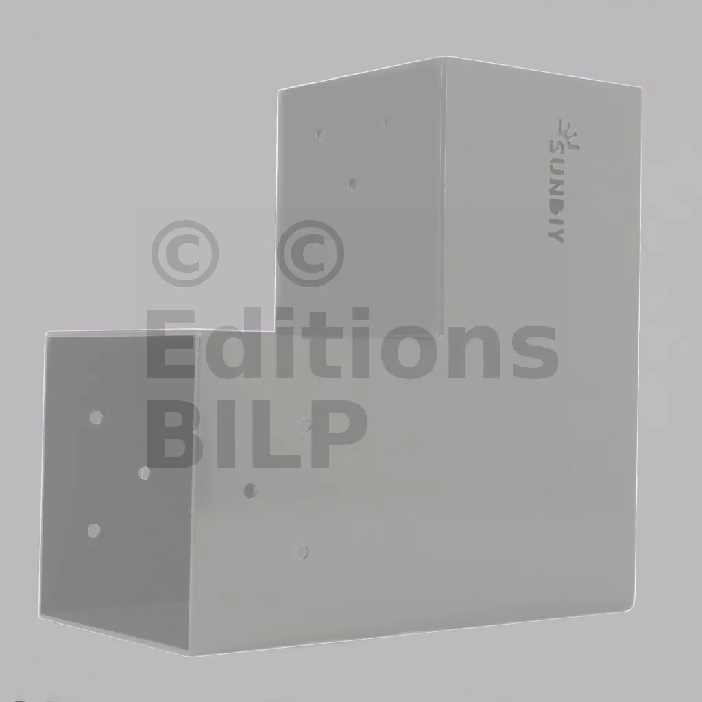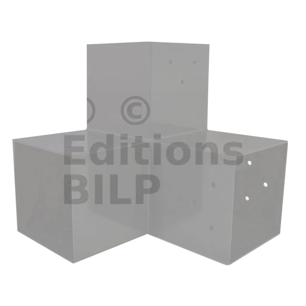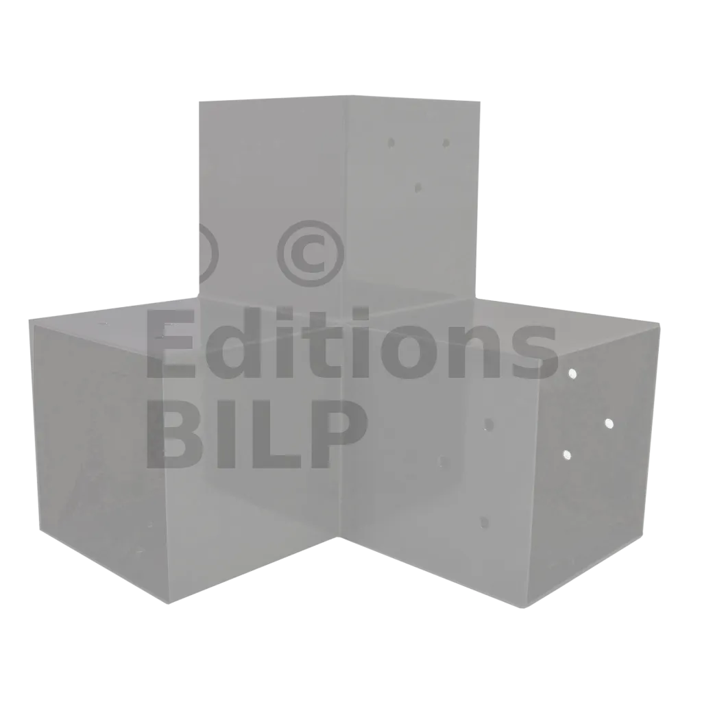 Il est utilisé dans un angle extérieur. Ce connecteur va permettre de raccorder une grosse poutre 120x120mm perpendiculairement à une poutre 120x120mm, le tout étant supporté par un poteau vertical 120x120mm.