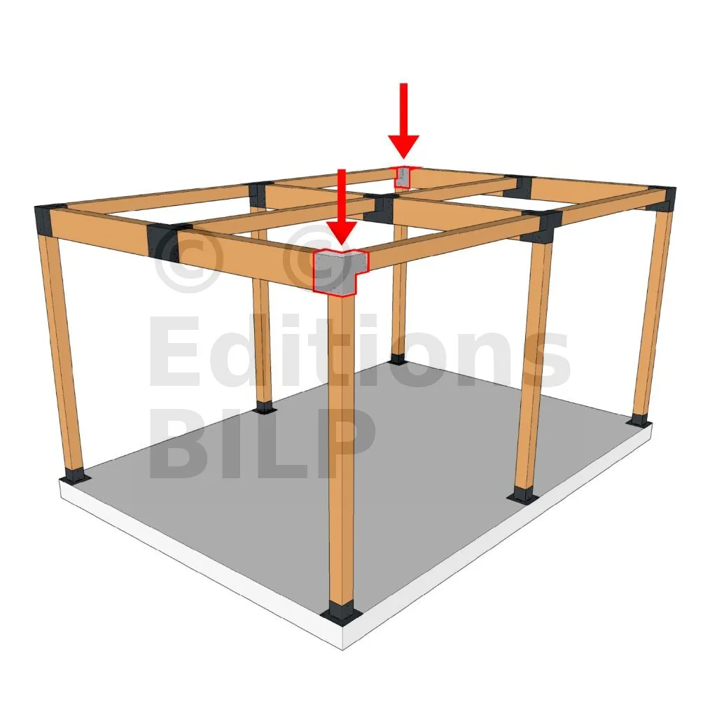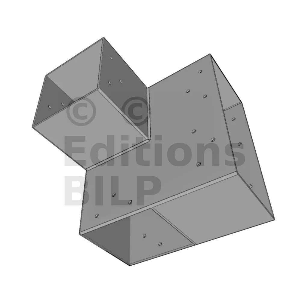 Il est utilisé dans un angle extérieur. Ce connecteur va permettre de raccorder une grosse poutre 240x120mm perpendiculairement à une poutre 120x120mm, le tout étant supporté par un poteau vertical 120x120 mm.