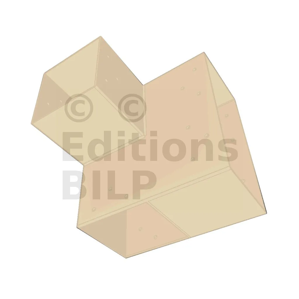 Il est utilisé dans un angle extérieur. Ce connecteur va permettre de raccorder une grosse poutre 240x120mm perpendiculairement à une poutre 120x120mm, le tout étant supporté par un poteau vertical 120x120 mm.