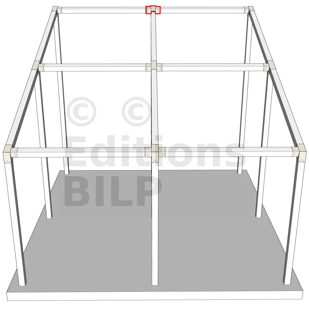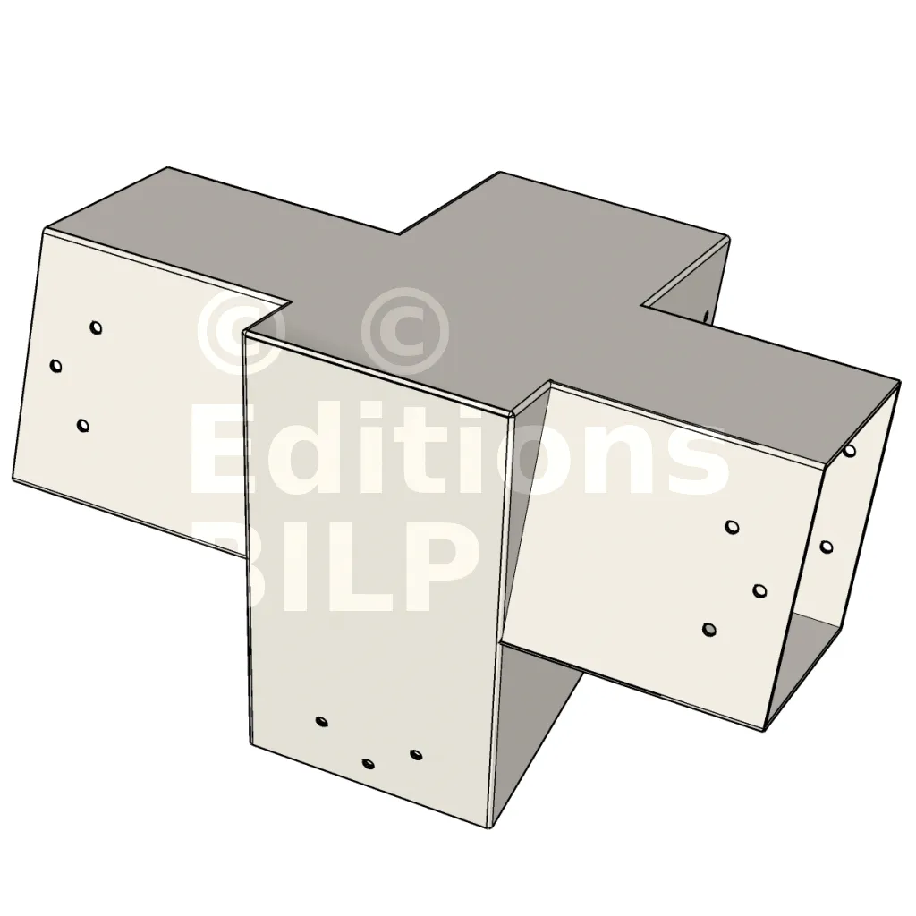 Connecteur d’angle intérieur à quatre directions conçu pour l’assemblage de poutres en section 120x120 mm avec un chevron de même section incliné à 20°. Il assure la jonction structurelle entre les éléments horizontaux, le chevron incliné et un poteau porteur vertical en 120x120 mm.