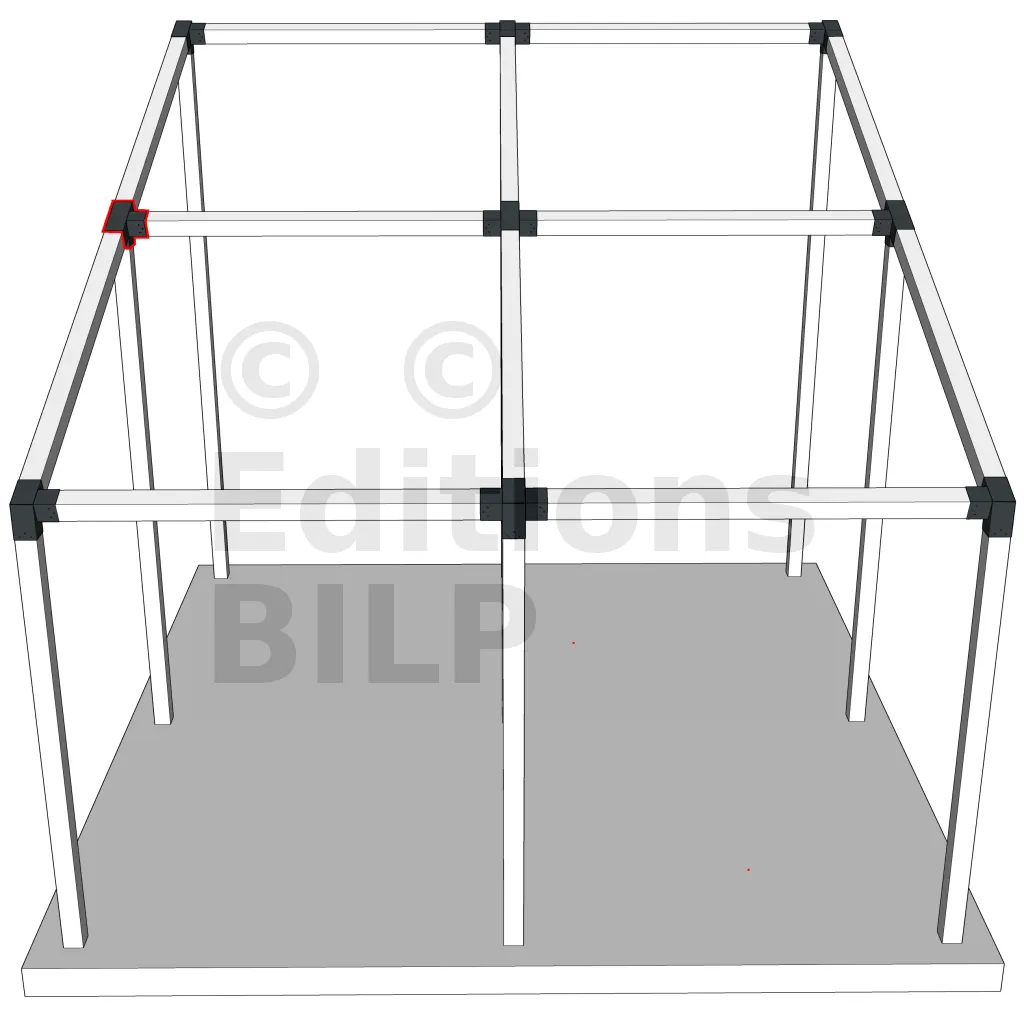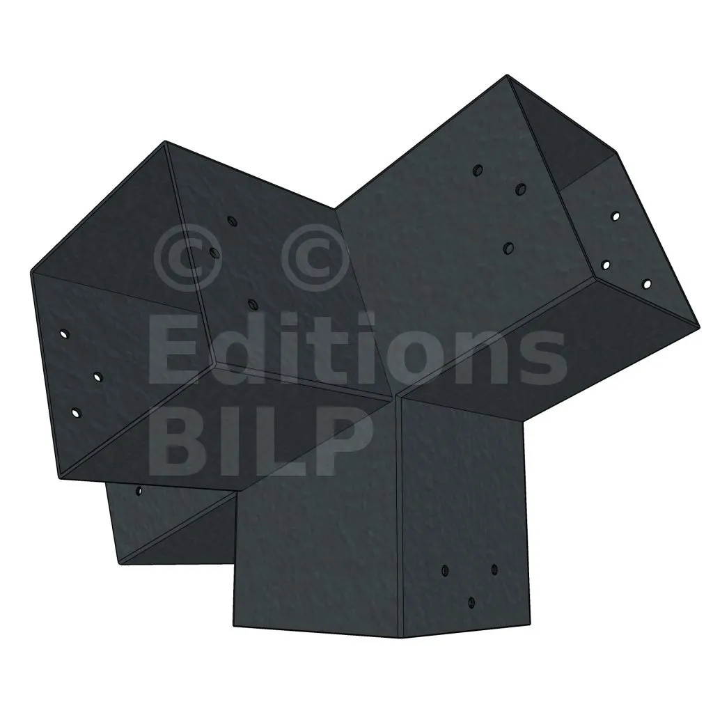 Connecteur d’angle intérieur à quatre directions, conçu pour l’assemblage de deux poutres en section 120x120 mm formant un angle de 20° avec un poteau vertical de même section. Il assure une liaison structurelle rigide et orthogonale à mi-hauteur, garantissant la stabilité de l’ensemble.