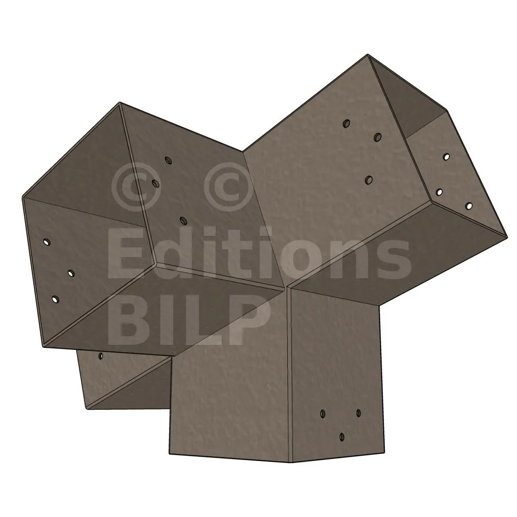 Connecteur d’angle intérieur à quatre directions, conçu pour l’assemblage de deux poutres en section 120x120 mm formant un angle de 20° avec un poteau vertical de même section. Il assure une liaison structurelle rigide et orthogonale à mi-hauteur, garantissant la stabilité de l’ensemble.