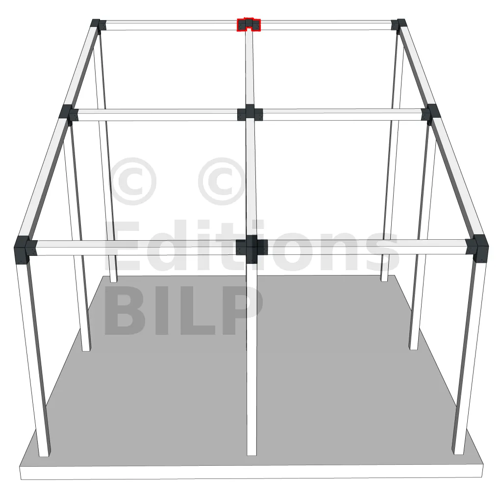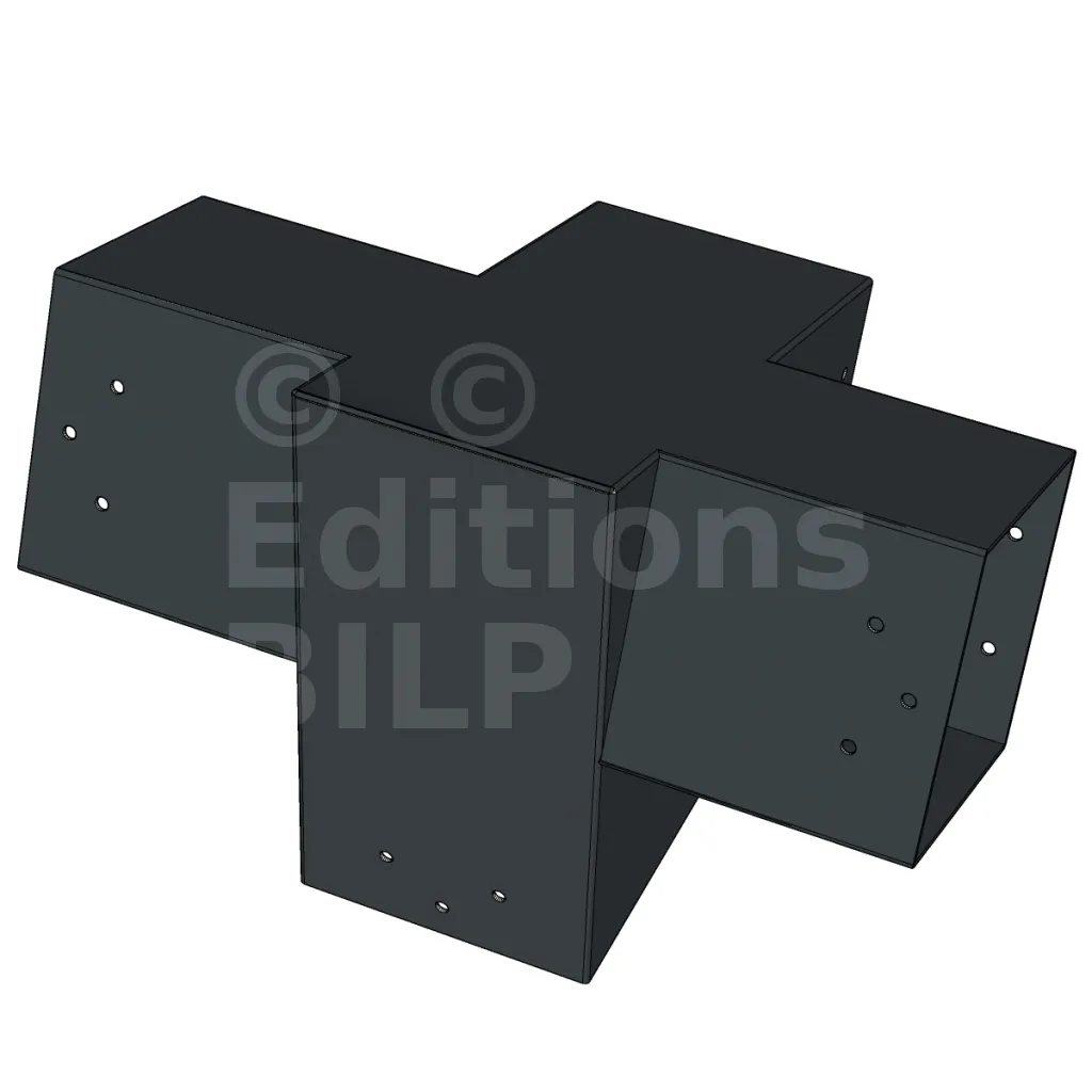 Connecteur d’angle intérieur à quatre directions conçu pour l’assemblage de poutres en section 120x120 mm avec un chevron de même section incliné à 20°. Il assure la jonction structurelle entre les éléments horizontaux, le chevron incliné et un poteau porteur vertical en 120x120 mm.