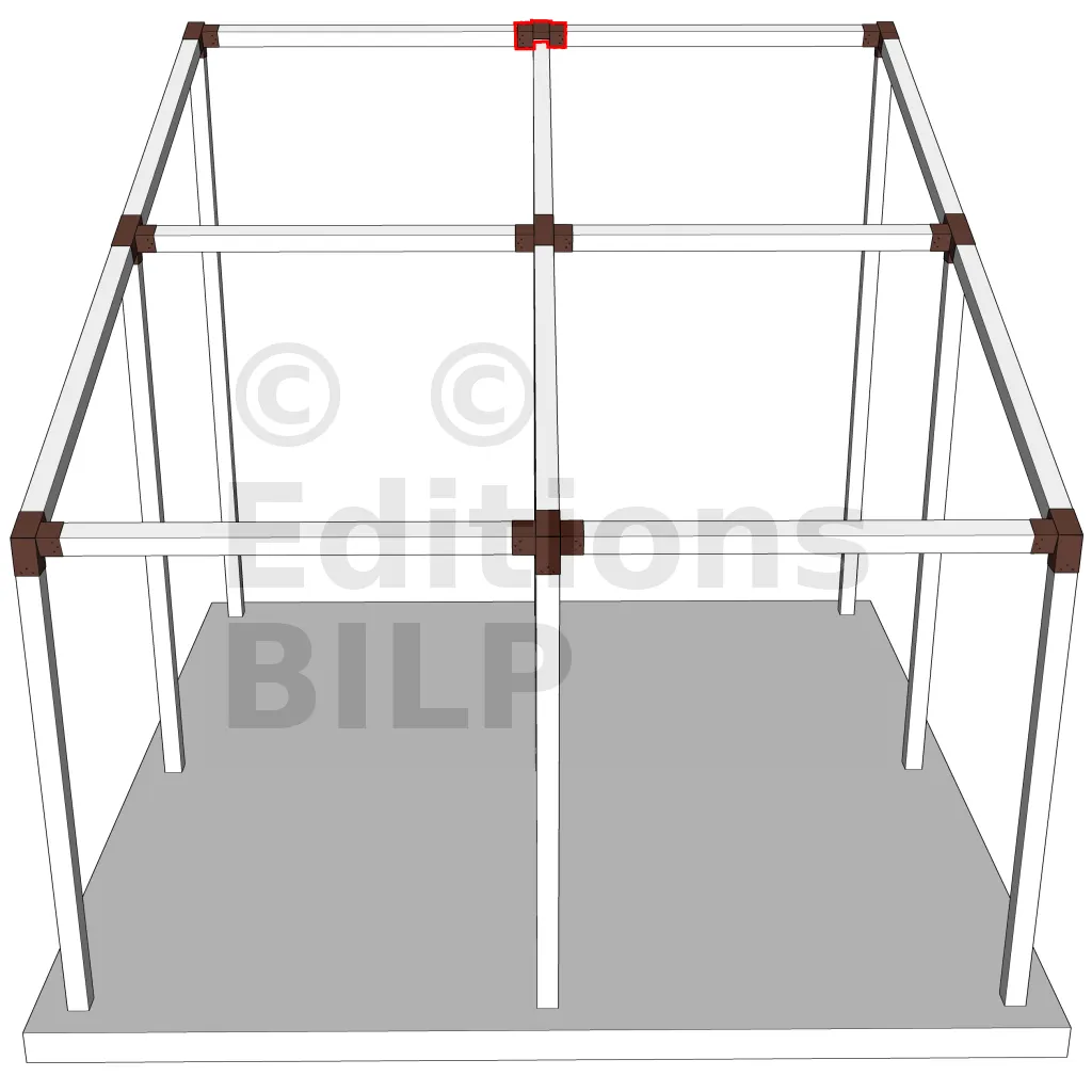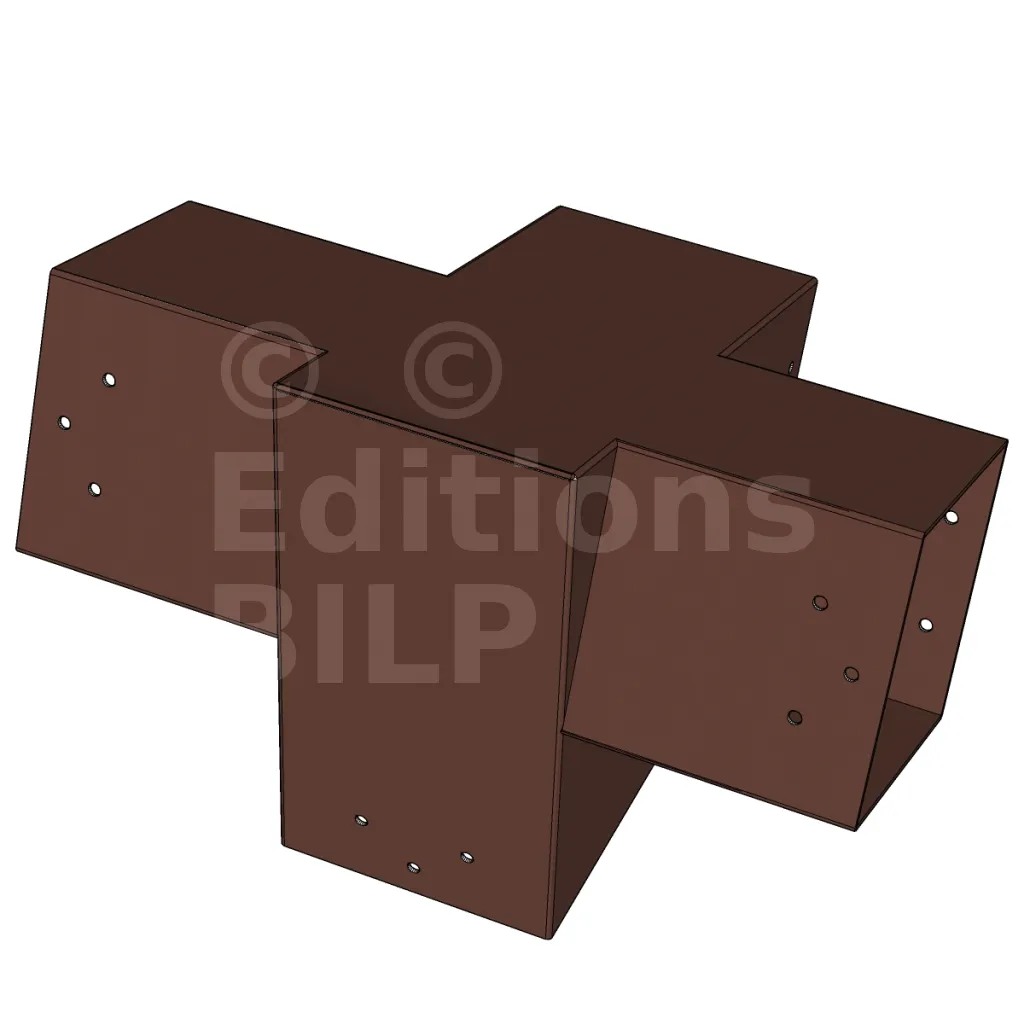 Connecteur d’angle intérieur à quatre directions conçu pour l’assemblage de poutres en section 120x120 mm avec un chevron de même section incliné à 20°. Il assure la jonction structurelle entre les éléments horizontaux, le chevron incliné et un poteau porteur vertical en 120x120 mm.