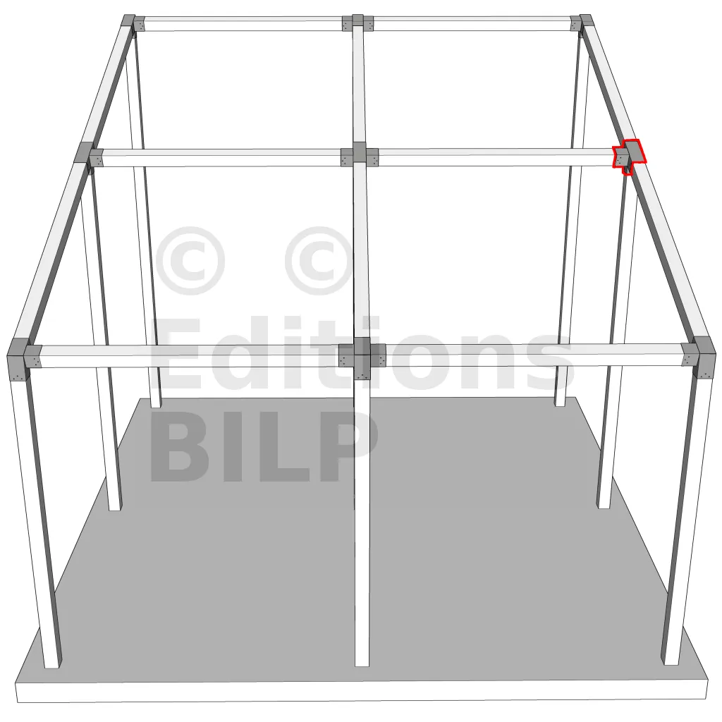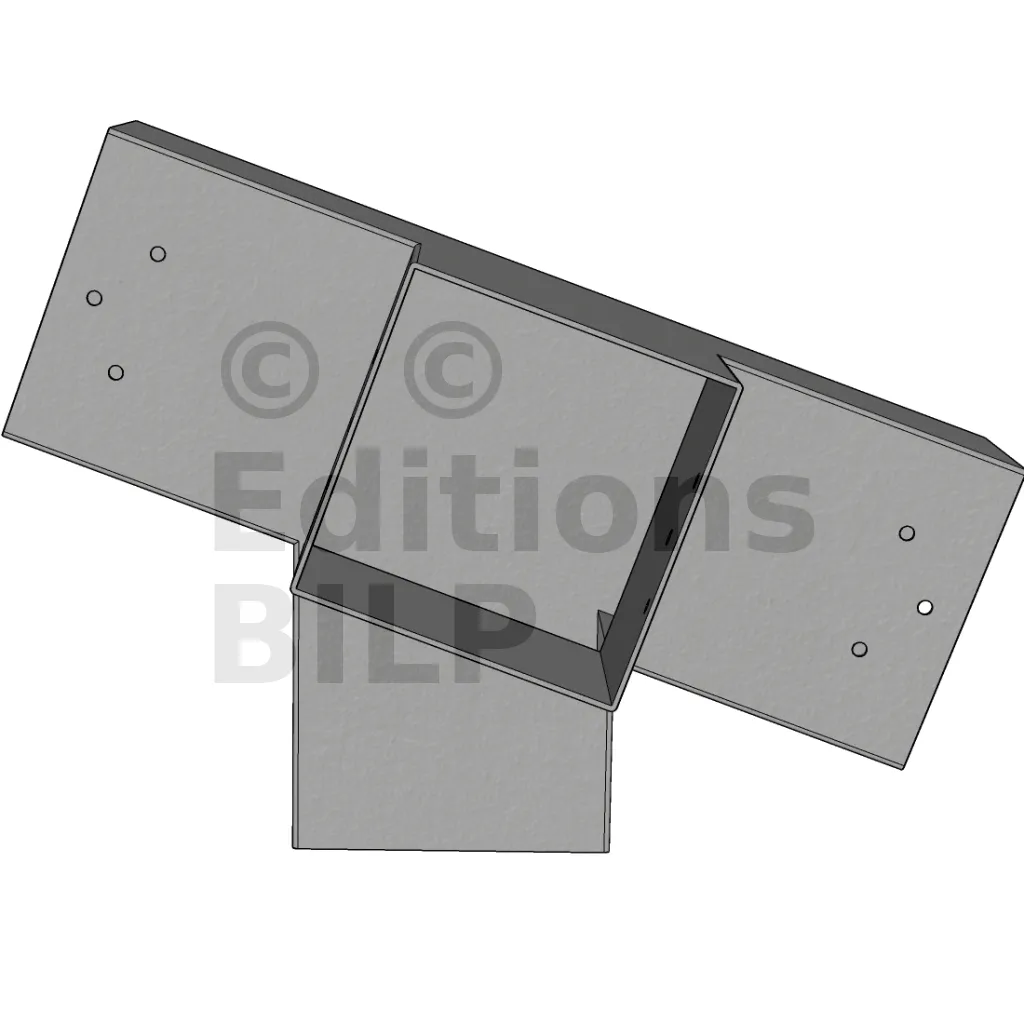 Connecteur d’angle intérieur à quatre directions, conçu pour l’assemblage de deux poutres en section 120x120 mm formant un angle de 20° avec un poteau vertical de même section. Il assure une liaison structurelle rigide et orthogonale à mi-hauteur, garantissant la stabilité de l’ensemble.