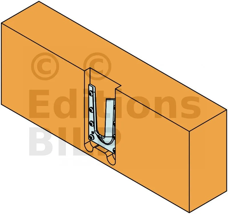 L’étrier à queue d’aronde en acier ETSN est un connecteur innovant et très discret. Il permet de reproduire l’esthétique d’un assemblage traditionnel à queue d’aronde. La partie femelle est placée sur la poutre porteuse avec des vis CSA ou des pointes CNA, tandis que la partie mâle est fixée à l’extrémité de la poutre portée avec les vis à tête plate.