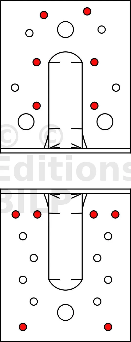 - Fixation BOIS/BOIS - clouage totalAile A : 10 ; Aile B : 14 ; type : Pointes annelées CNA Ø4.0x35 ou Ø4.0x50 mm, Vis CSA Ø5.0x35 ou CSA Ø5.0x40