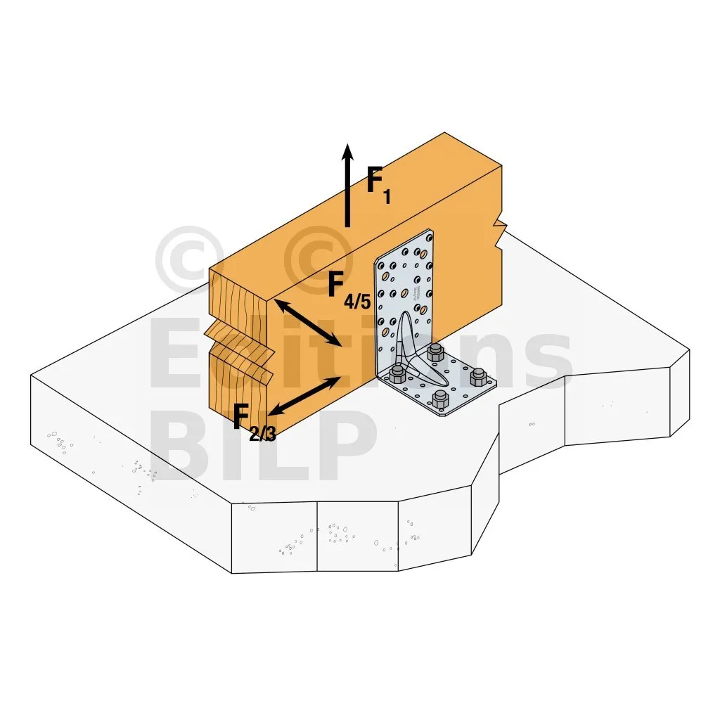 Le niveau de résistance design du boulon R#,d est déterminé par (coefficient boulon x charge design du connector F#,d) pour la direction d’effort et fixations correspondantes. Referez vous à la gamme d’ancrages Simpson Strong-Tie pour les ancrages adaptés. Les solutions classiques sont BOAXII, SET-XP, WA, AT-HP, en fonction du type de béton, espacement et distances aux bords.