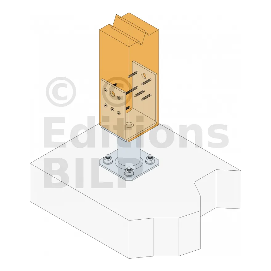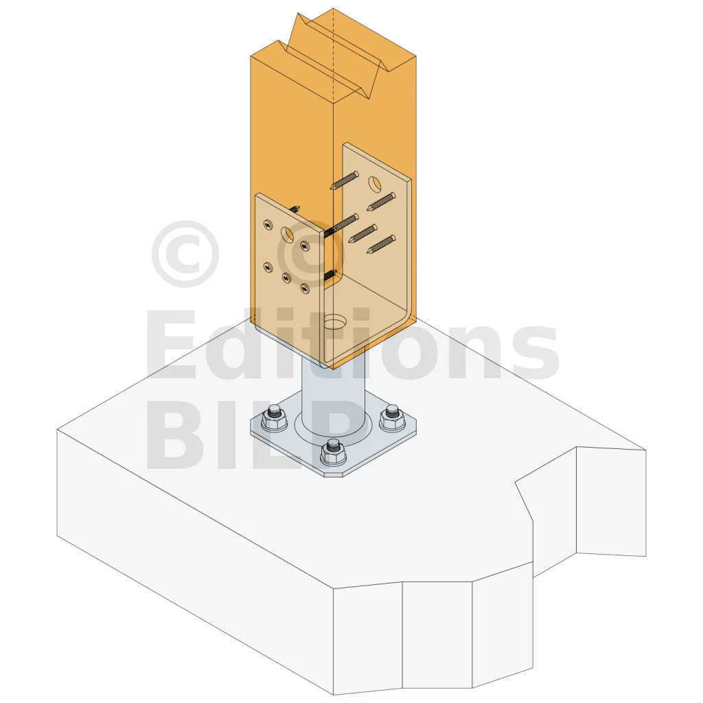 - Connexion bois sur support rigideSur poteau : 10xCNA4.0x40 Sur béton : 4Ø10