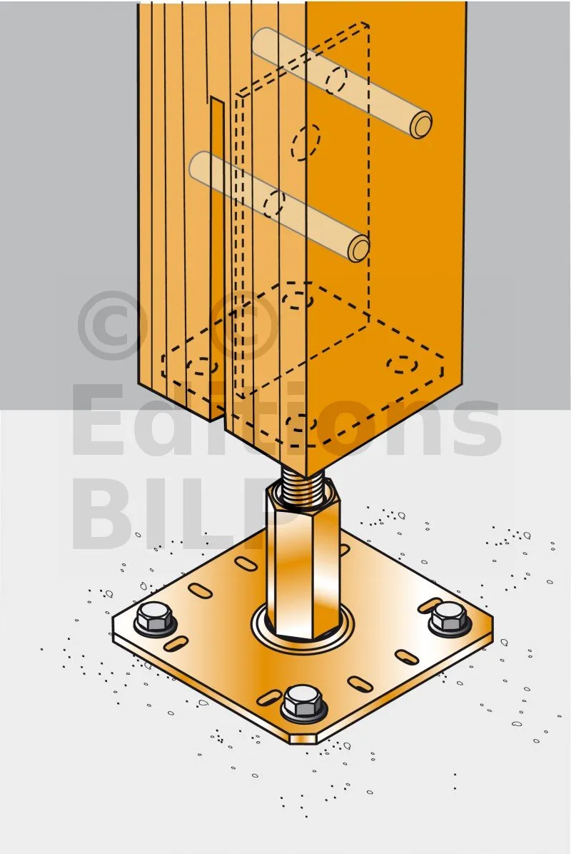 - Connexion bois sur support rigideSur poteau : 2 STD12 ; sur béton : 4Ø10 (goujons WA M10 ; tige filetée M10) ; sur acier : boulons