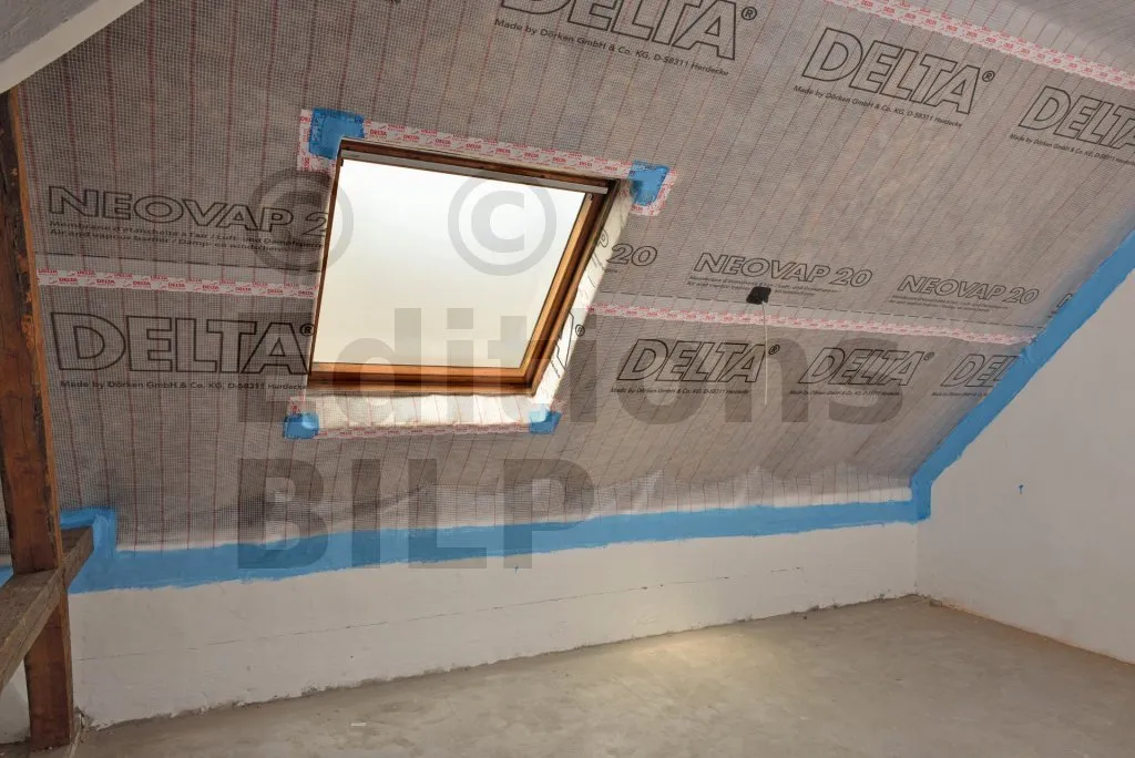 - Couche d’étanchéité à l’air sous rampants isolés (constructions traditionnelles ou à ossature bois).