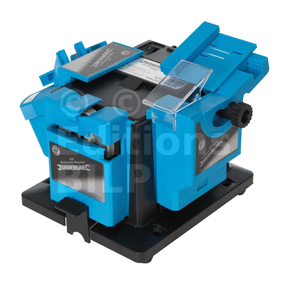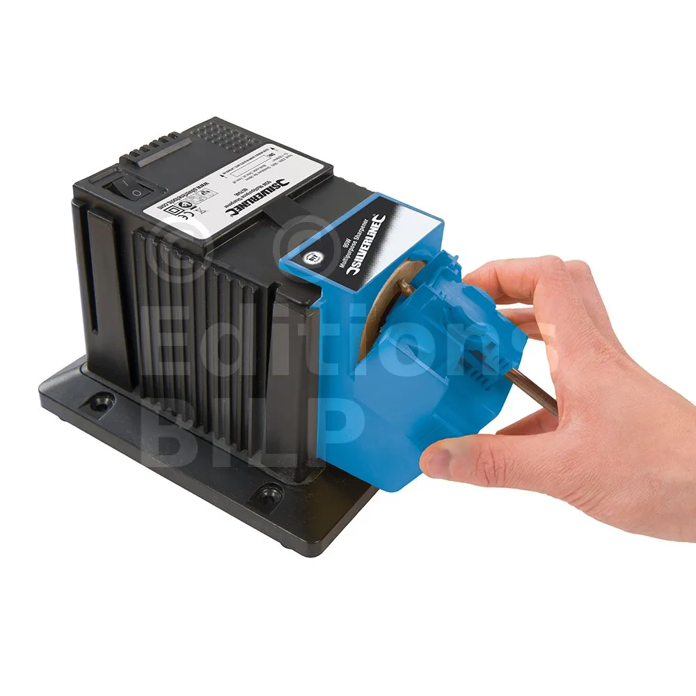 Appareil spécialement conçu pour réaliser l’affûtage de forets en acier HSS (acier rapide), burins, couteaux, ciseaux, fers de rabots, et autres lames. Comprend des gabarits afin d’obtenir un réglage de l’angle d’affûtage d’une grande précision. Garantit un affûtage rapide et soigné. Pour mèches en acier HSS (acier rapide) de 3 à 13 mm de diamètre et pour lames de 6 à 51 mm de largeur. Polyvalent et facile d’utilisation. Disques de meulage de rechange disponibles.