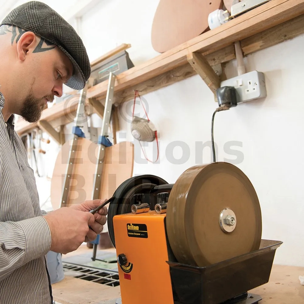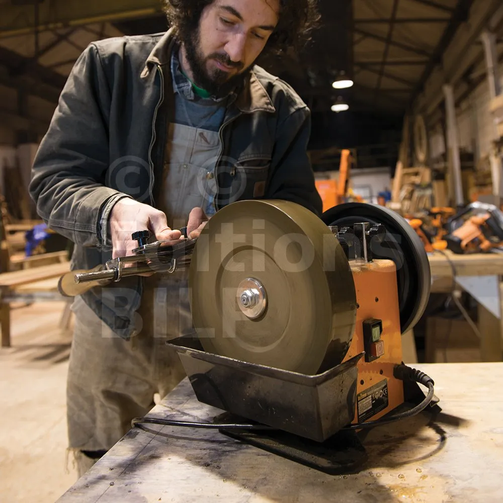 Touret d’affûtage avec meule pré-équilibrée grain 220 de haute qualité. Système lent de refroidissement par eau pour éviter de surchauffer et de perdre en qualité d’affûtage. Affûtage très facile vous permettant d’obtenir exactement le résultat voulu. Disque d’émorfilage en cuir avec pâte d’affilage pour polir les tranchants. Moteur à induction garantissant une meilleure performance et durée de vie de l’appareil. Comprend : bras de support, guide d’angle, gabarit d’affûtage pour outils droits et prépare-meule.