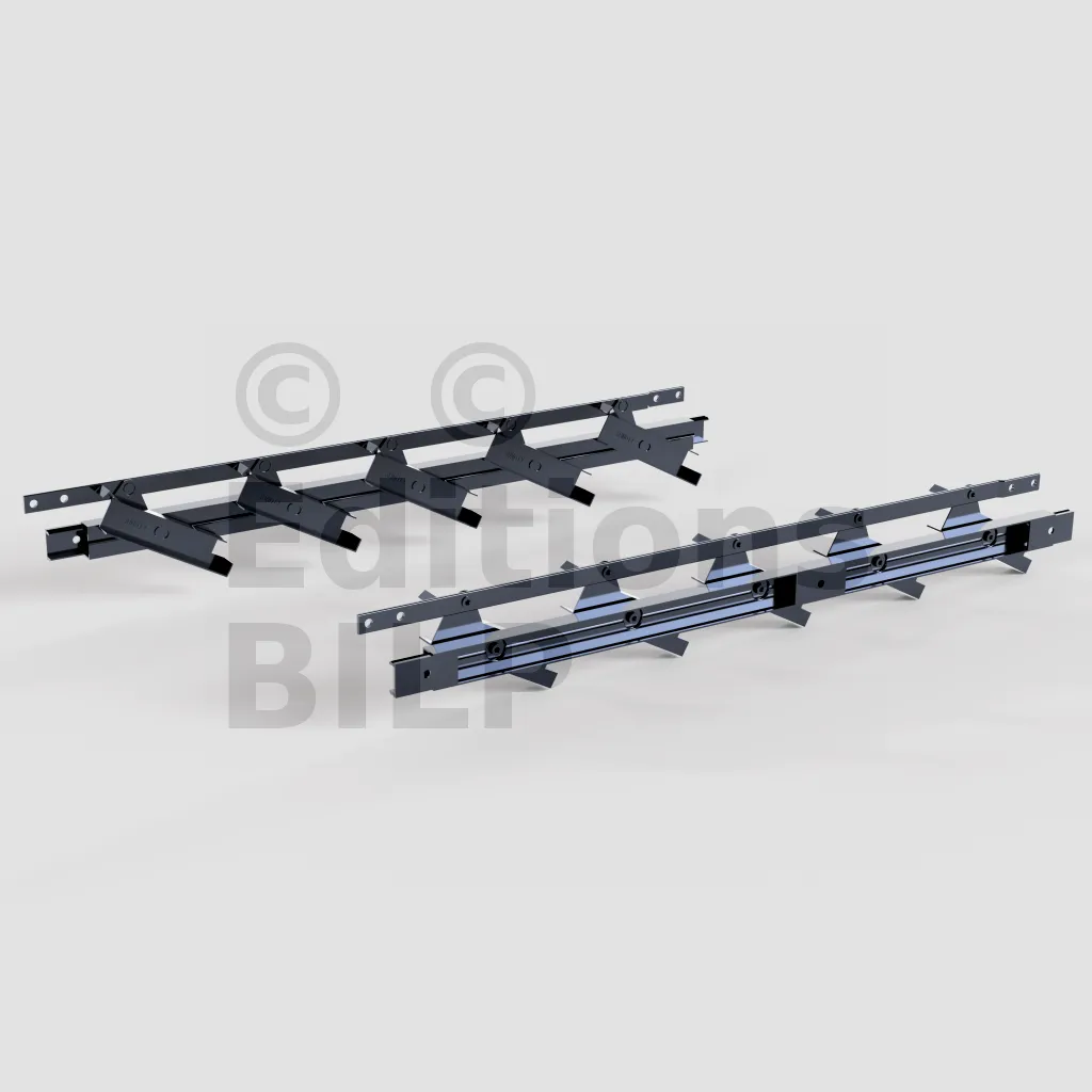 est constitué du mécanisme en ALU supportant 5 lames d’épaisseurs 20mm ALU ou 27mm BOIS. Les mécanismes peuvent être connectés bout à bout pour couvrir des hauteurs/profondeurs de 50, 100, 150cm, etc...
