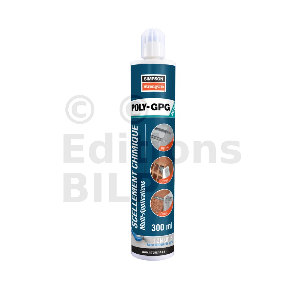 La résine multi-applications POLY-GPG Plus est préconisée pour la fixation de fers à béton, tiges filetées dans le béton non fissuré et dans les maçonneries creuses et pleines.