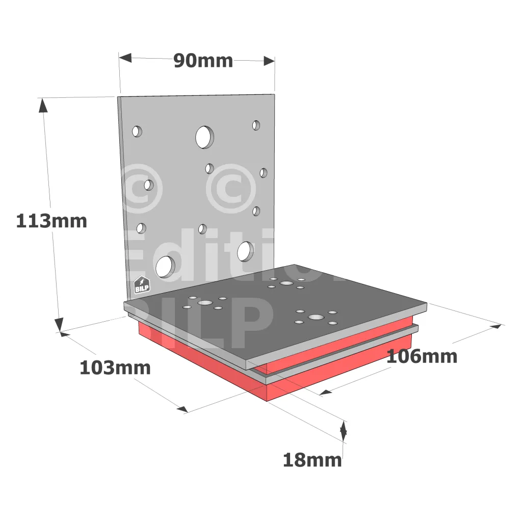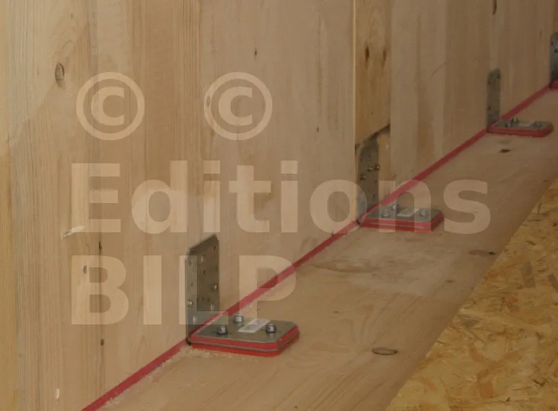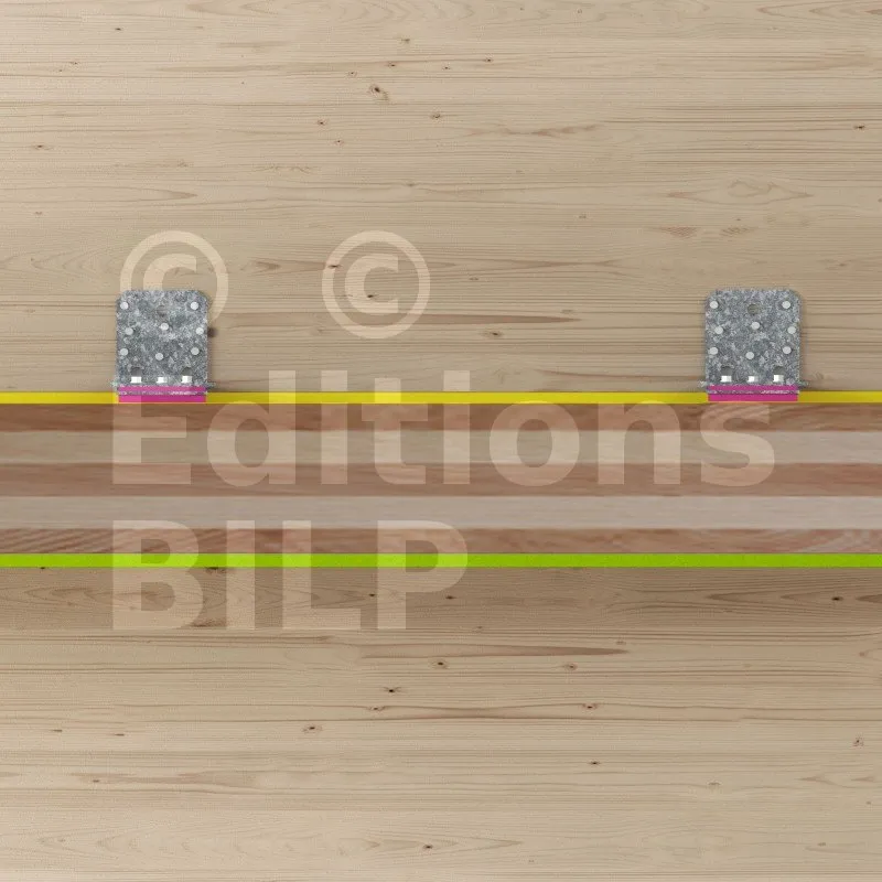 Pour une efficacité totale, la présence d’une bande Sylodyn® sous les panneaux murs CLT est impérative. Le choix des bandes Sylodyn® dépend du poids du mur (voir tableau ci-dessous). Un gabarit de montage (réf. MOABAI) est disponible pour une meilleure pose de l’équerre ABAI. Il évite en effet la compression de la bande de Sylodyn® présente sous l’équerre.