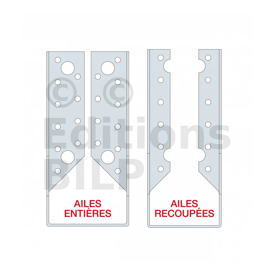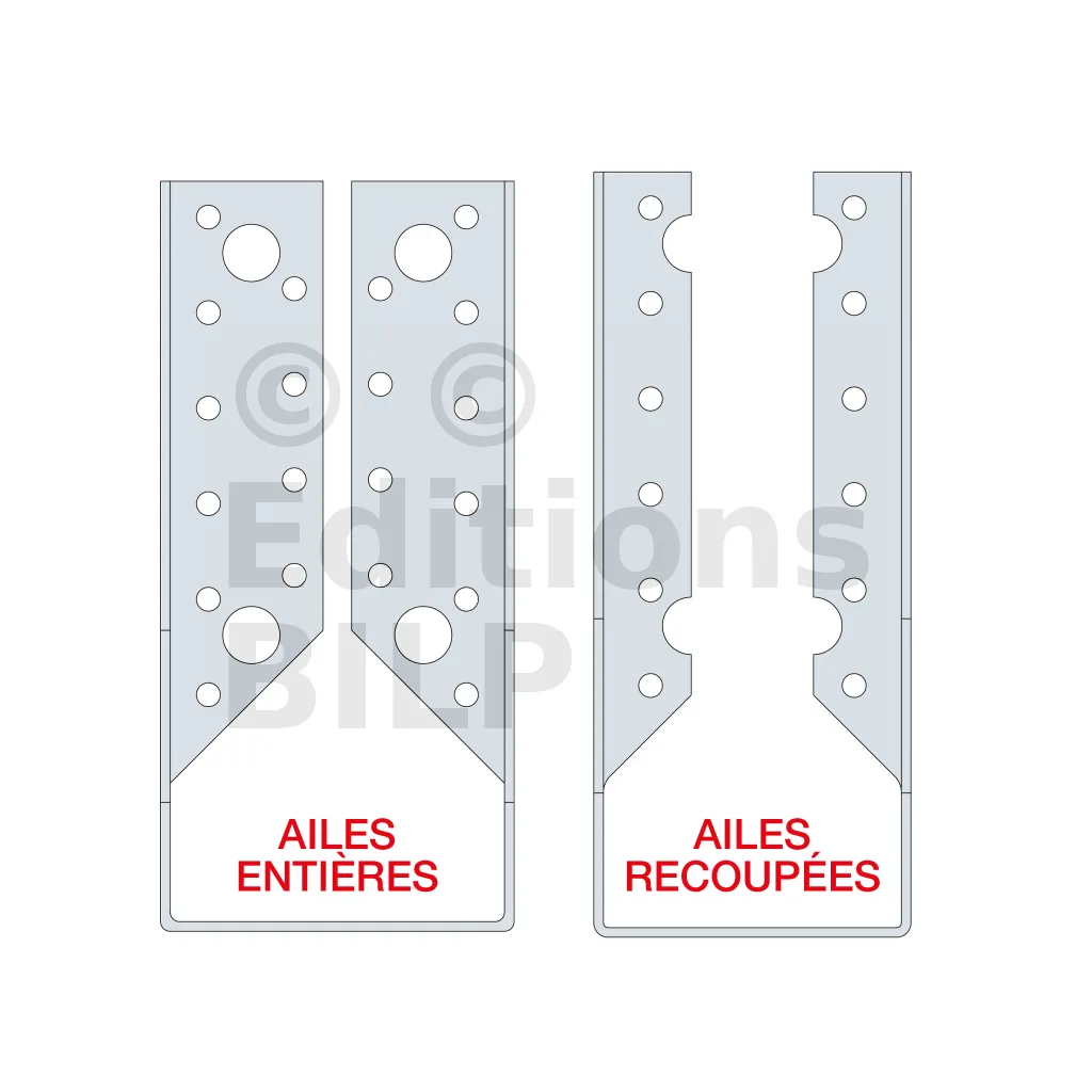 | Références | Développé [mm] | Avec perçages de pointes uniquement (ailes recoupées) | Avec perçages de tirefonds et pointes (ailes entières) |