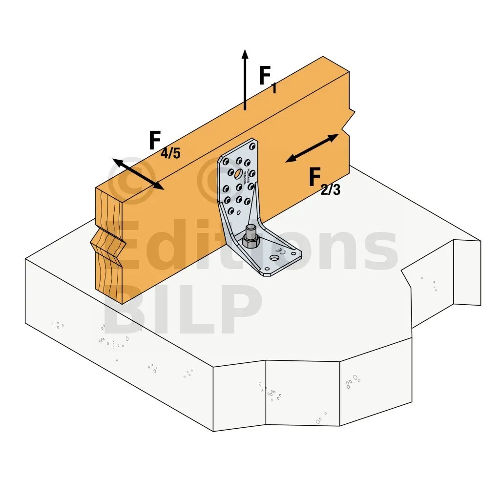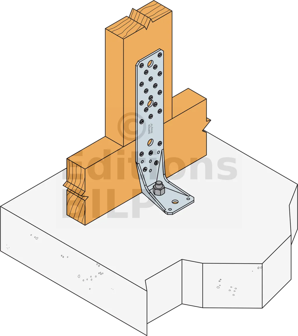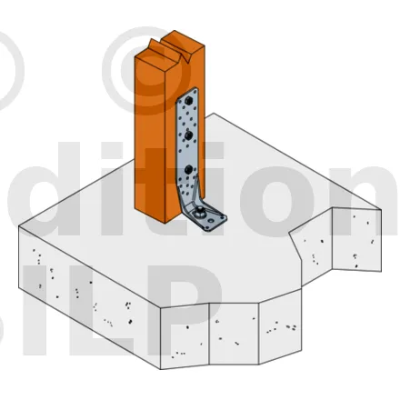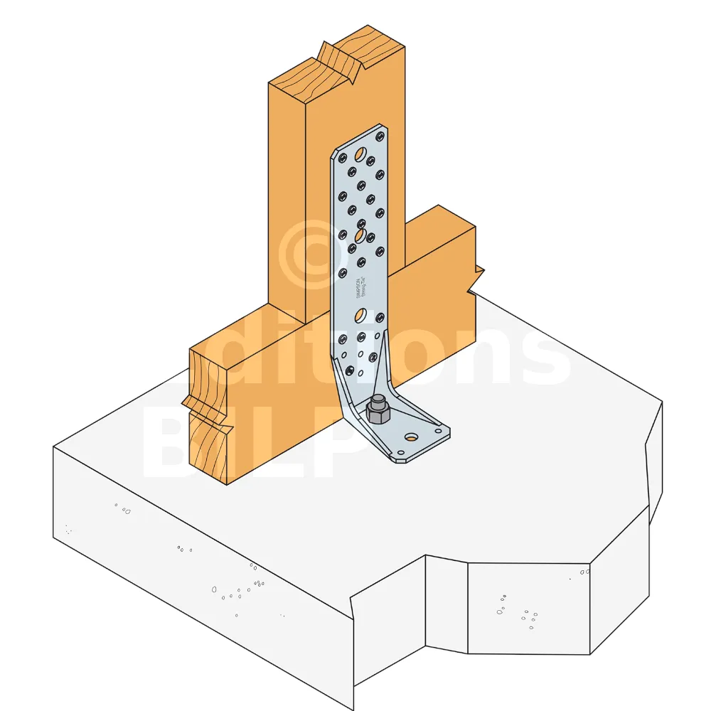 Voir la gamme d’ancrage Simpson Strong-Tie pour trouver le produit adéquat. Les solutions d’ancrage typiques sont BOAXII, SET-XP, WA, AT-HP et dépendent du type de béton, l’entraxe et les distances aux bords.