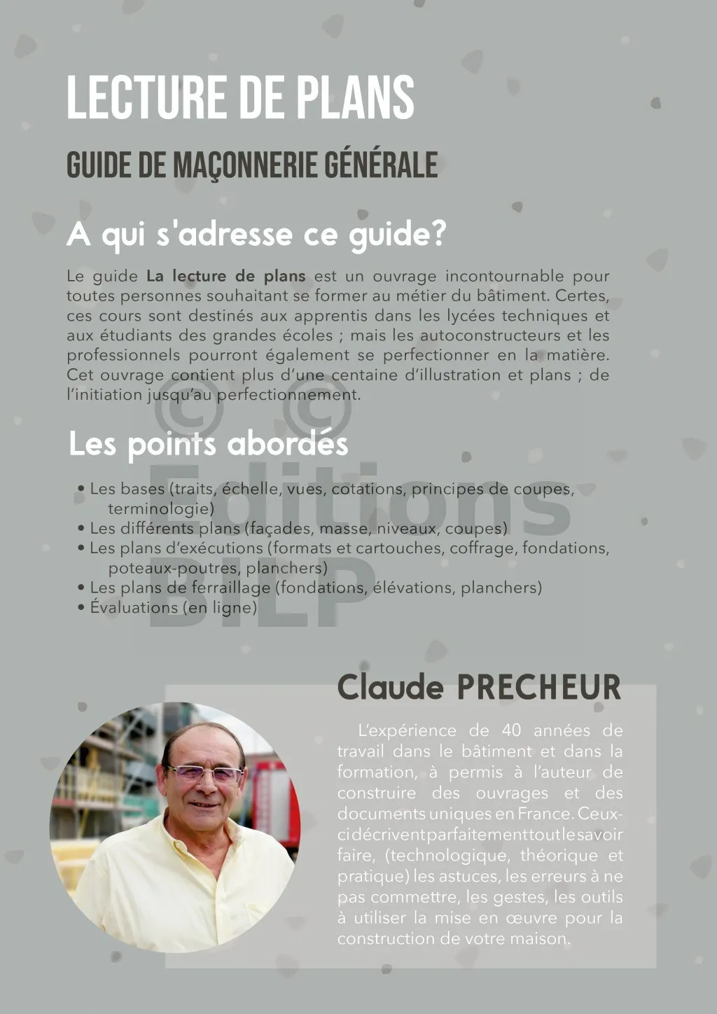 L’expérience de 40 années de travail dans le bâtiment et dans la formation, a permis à l’auteur de construire des ouvrages et des documents uniques en France. Ceux-ci décrivent parfaitement tout le savoir faire, les astuces, les erreurs à ne pas commettre, les gestes, les outils à utiliser et la mise en œuvre pour la construction de votre maison. Que ce soit la construction principale, les annexes, les extensions, la rénovation ou les simples travaux d’extérieur. Le tout pédagogiquement afin que chacun d’entre nous puisse comprendre et mettre en pratique les conseils fournis.