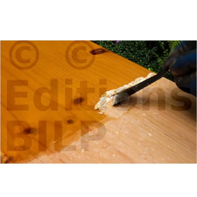 - Enlever la pâte obtenue avec une spatule ou une brosse à chiendent en nylon (selon dureté du bois). Sur bois fragile ou sur support intérieur pour un aspect soigné, préférer une brosse en laiton doux. Rincer le DSP 800 à l’aide d’une éponge humide imbibée d’eau tiède (attention à ne pas relever la fibre du bois, si besoin égrener avec du papier abrasif de grain moyen à fin).