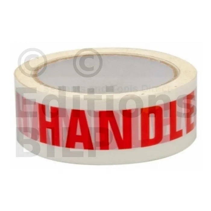 Lettres rouges sur fond blanc indiquant la mention en anglais HANDLE WITH CARE.