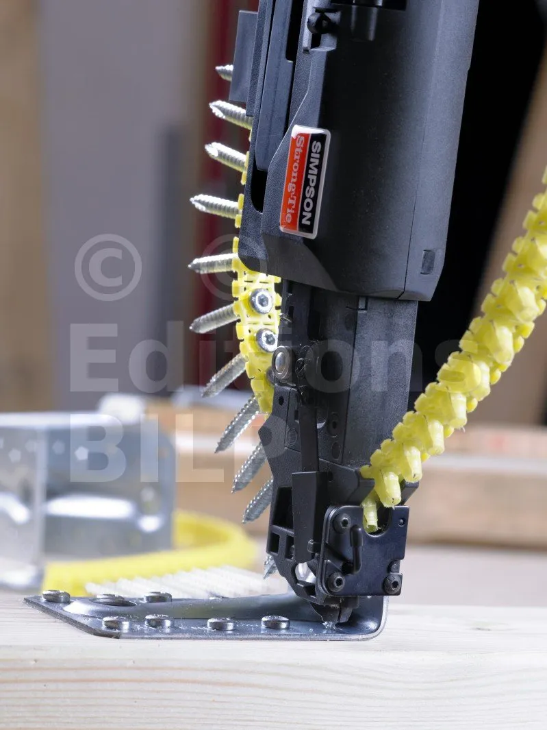 Les vis en bande CSA-T facilitent la mise en œuvre des équerres et des connecteurs sur support bois. La tête conique assure un contact complet avec le connecteur ce qui favorise la transmission des efforts.
