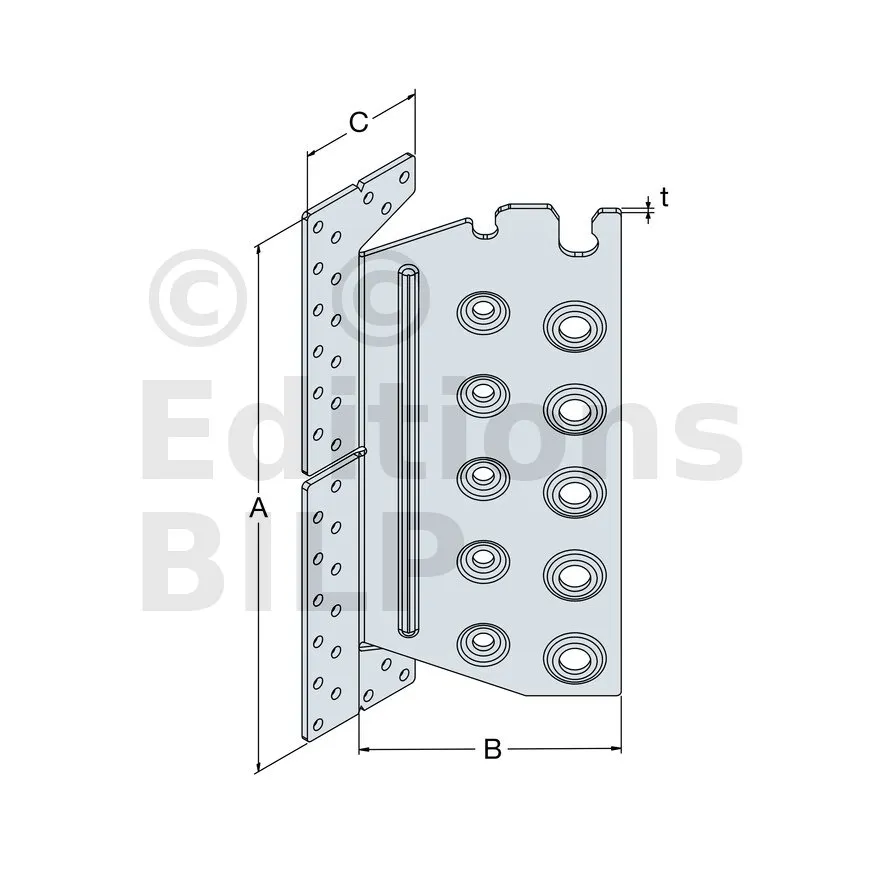 | Largeur | Hauteur | Largeur poteau | A | B | C | t | α [°] | Ø5 | Ø8,5 | Ø12,5 | ||||||