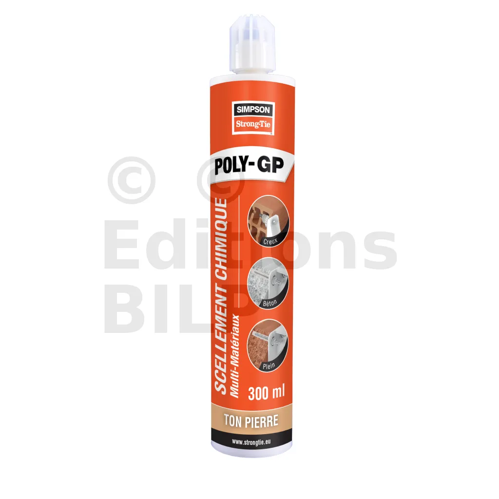La résine multi-matériaux POLY-GP est un ancrage chimique permettant de fixer les tiges filetées dans le béton C20/C25 à C50/60 et toutes les maçonneries creuses et pleines.