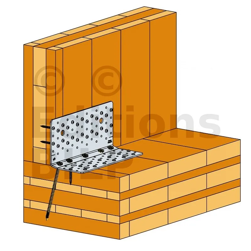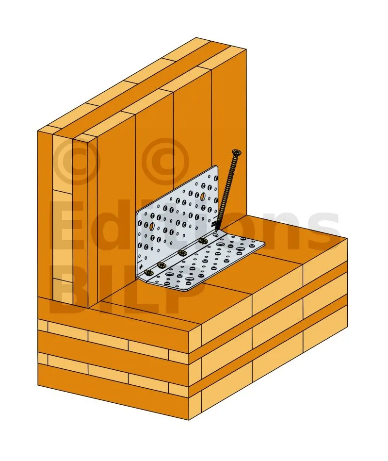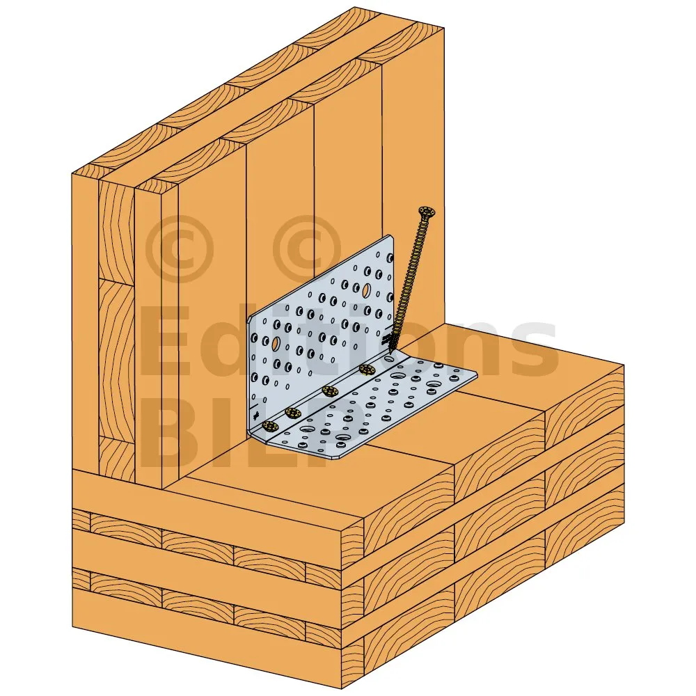 3- Insérer ensuite les vis filetage total dans les perçages proches du pli à un angle d’environ 70° (l’utilisation d’un gabarit est recommandé pour plus de rapidité et de précision).