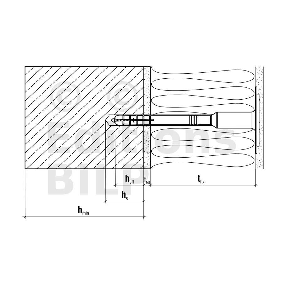 Longueur minimale de la cheville Ld = tfix + ttol + heff avec tfix : épaisseur maximale des pièces à fixer, ttol : épaisseur des sous-couches (adhésif + enduit existant), heff : profondeur d’ancrage.