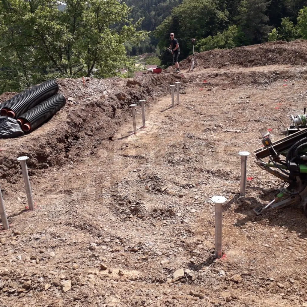 Pour les sols difficiles et complexes, nous utilisons des technologies additionnelles pour l’installation de pieux vissés, telles que le pré-perçage par compresseur HDT ou le carottage pour l’asphalte.