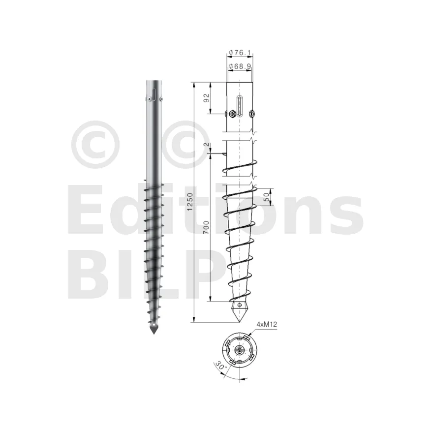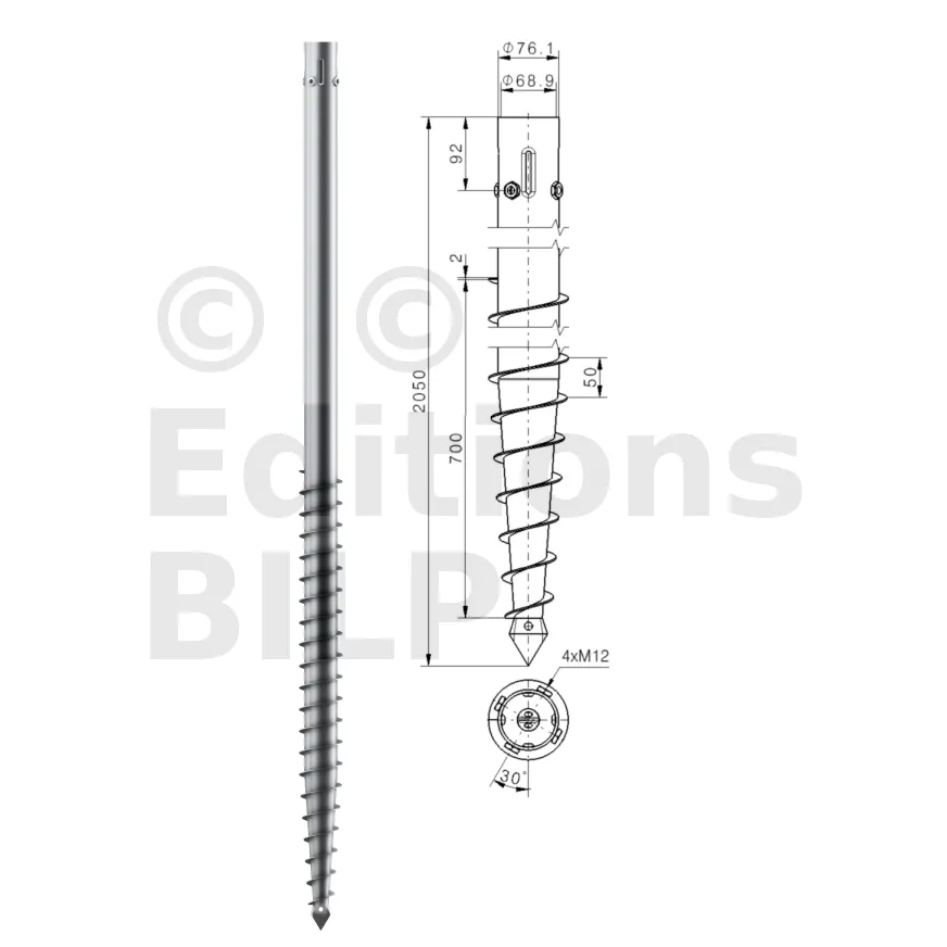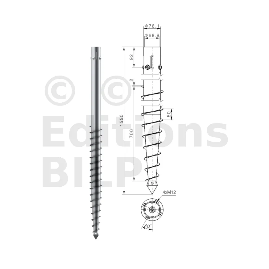 Une vis de fondation est donc composée d’un axe central avec :